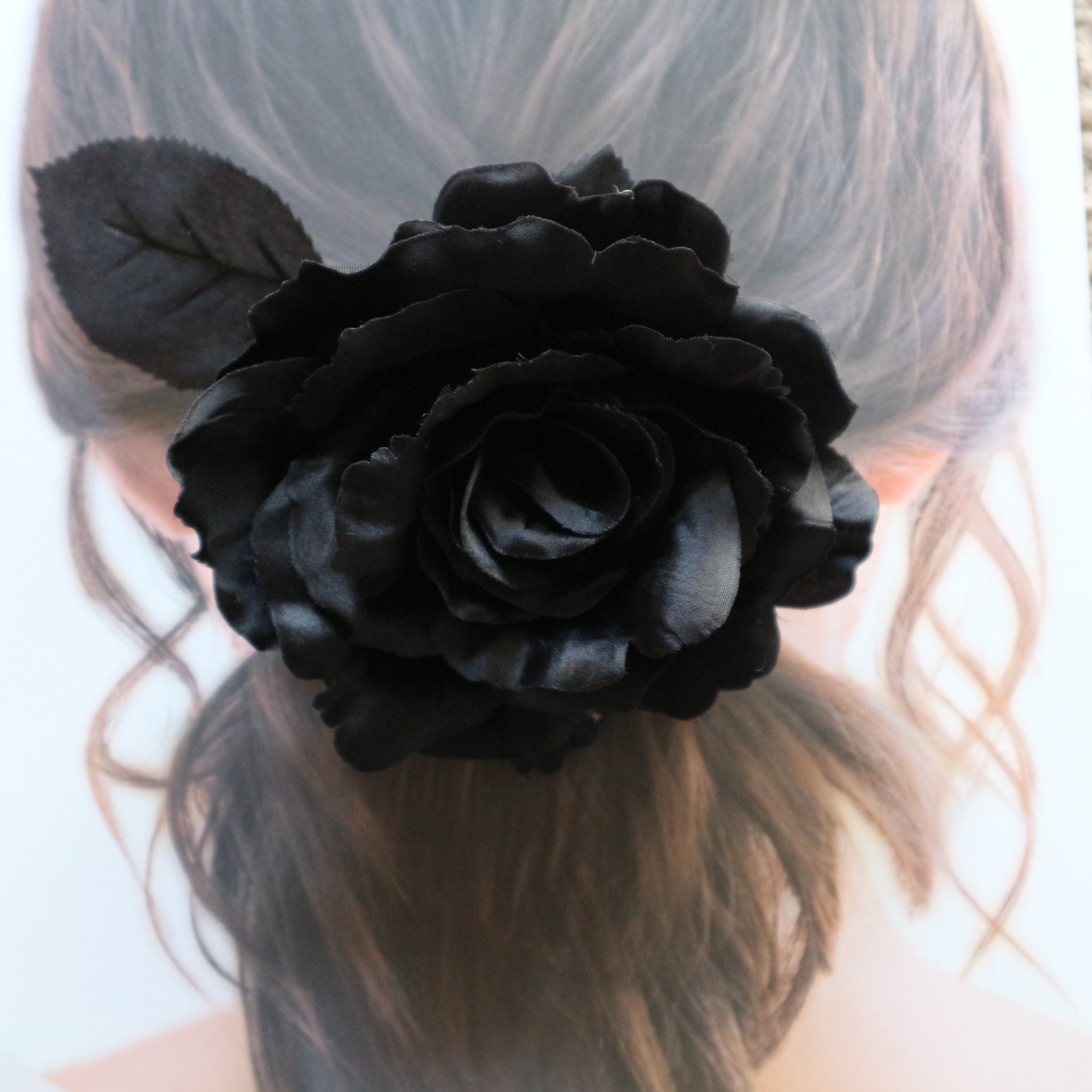 黒い薔薇一輪のフラメンコ向けの花飾り(フローレス)です。頭の上部分に付ける、モニョのサイドに付ける、他の花と合わせる等アレンジをお楽しみください。