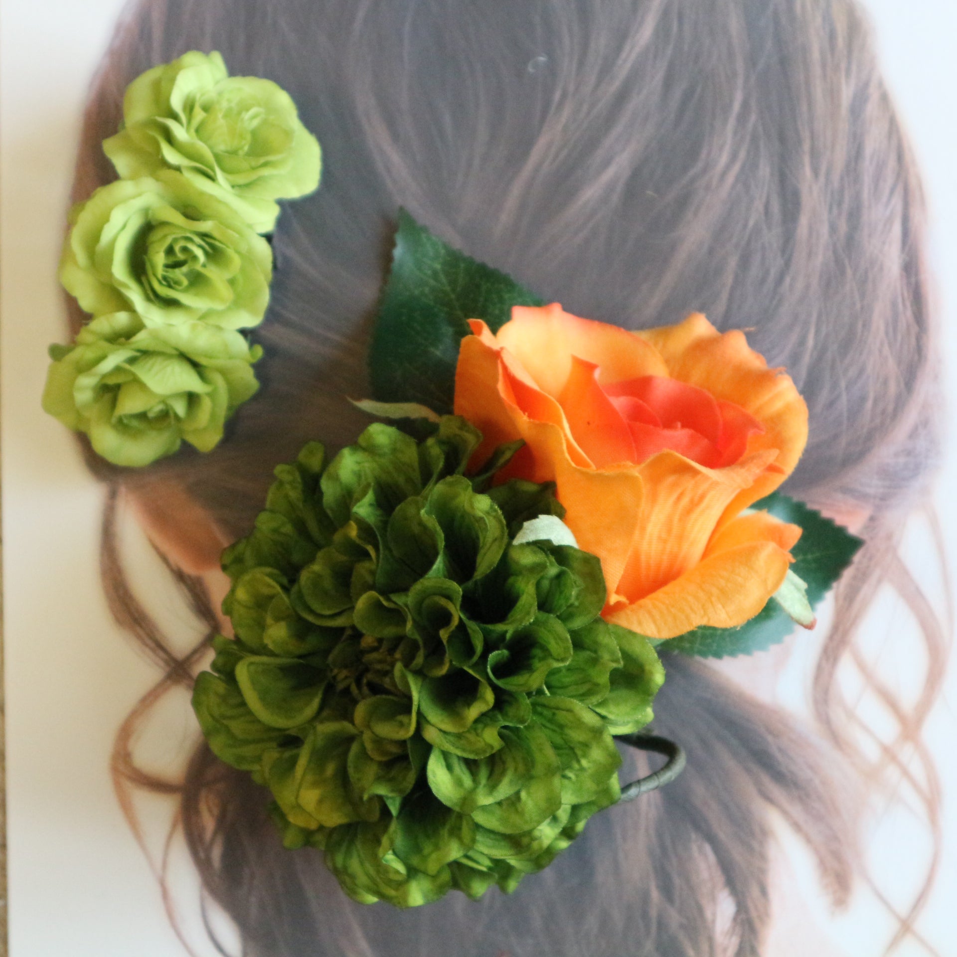 フラメンコ花髪飾り:フローレス(黄緑ダリヤ&オレンジ薔薇とミニ薔薇セット)