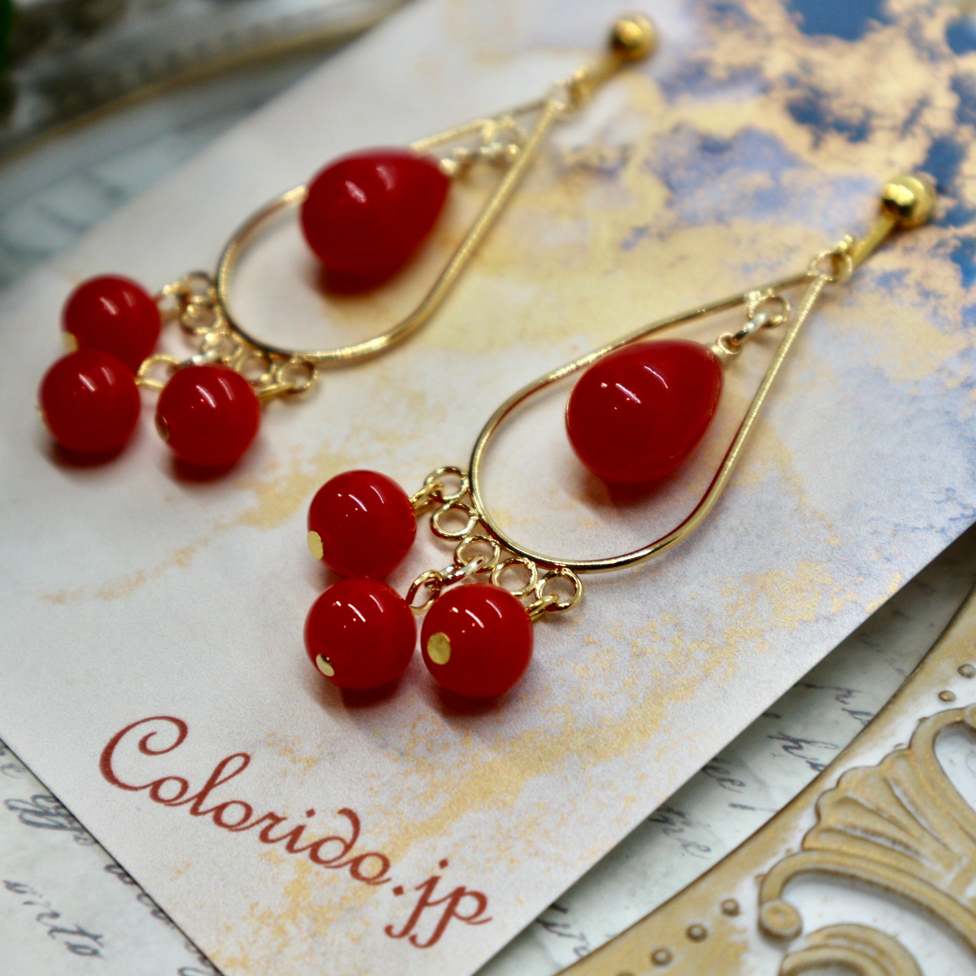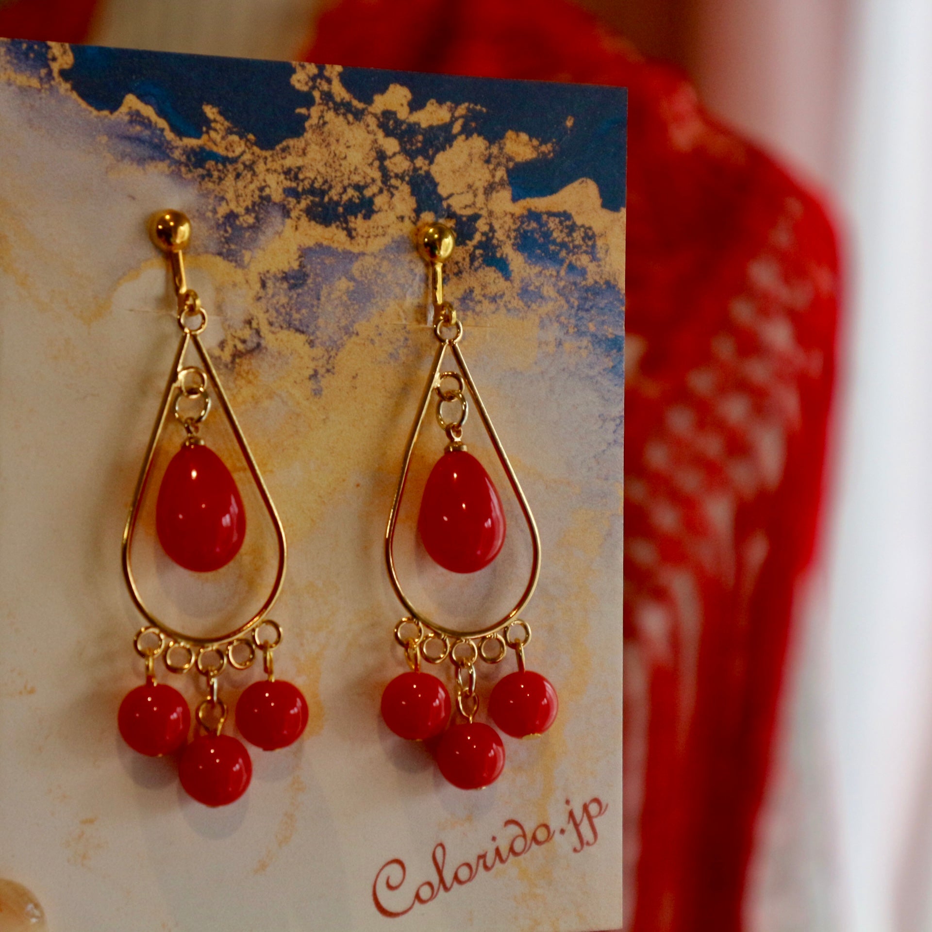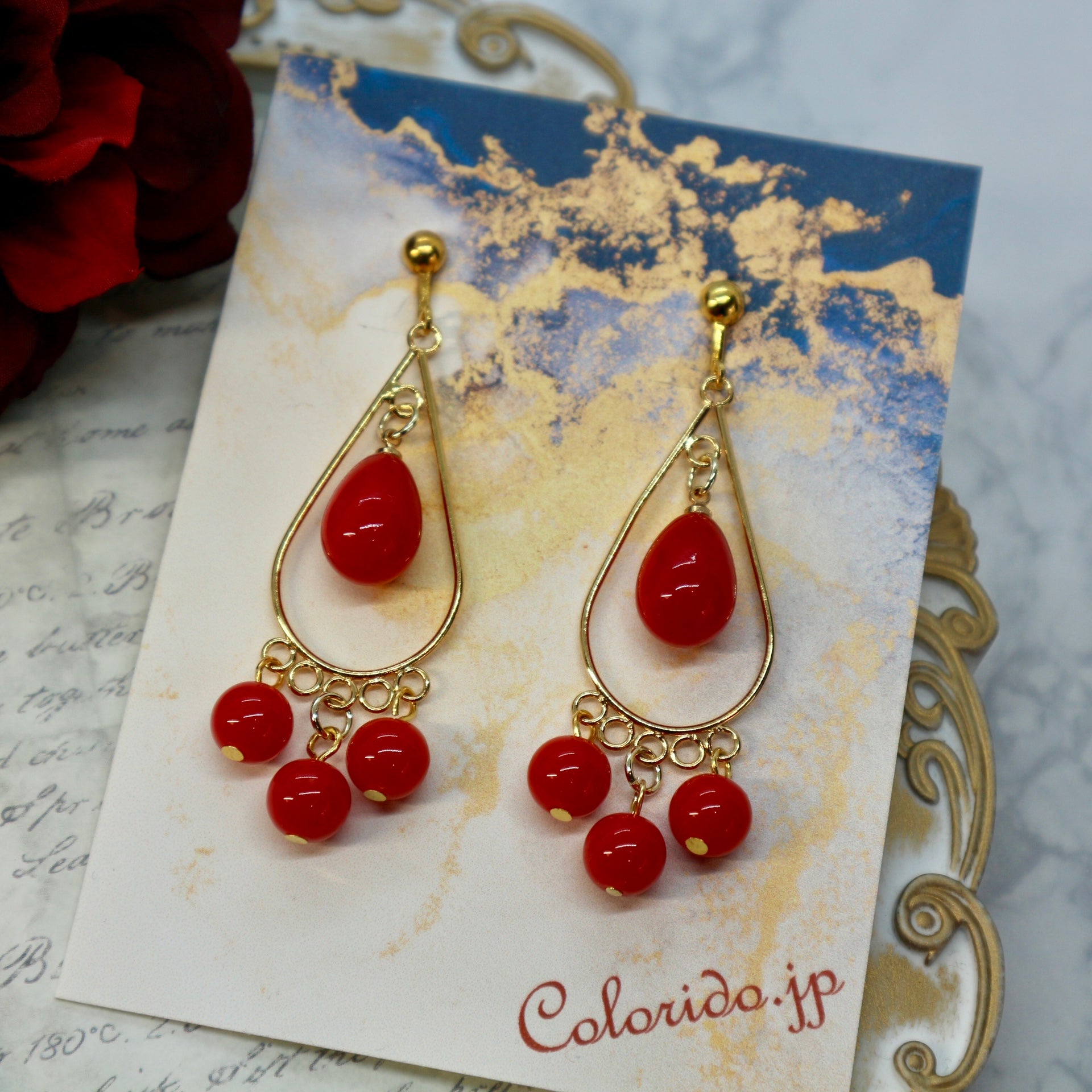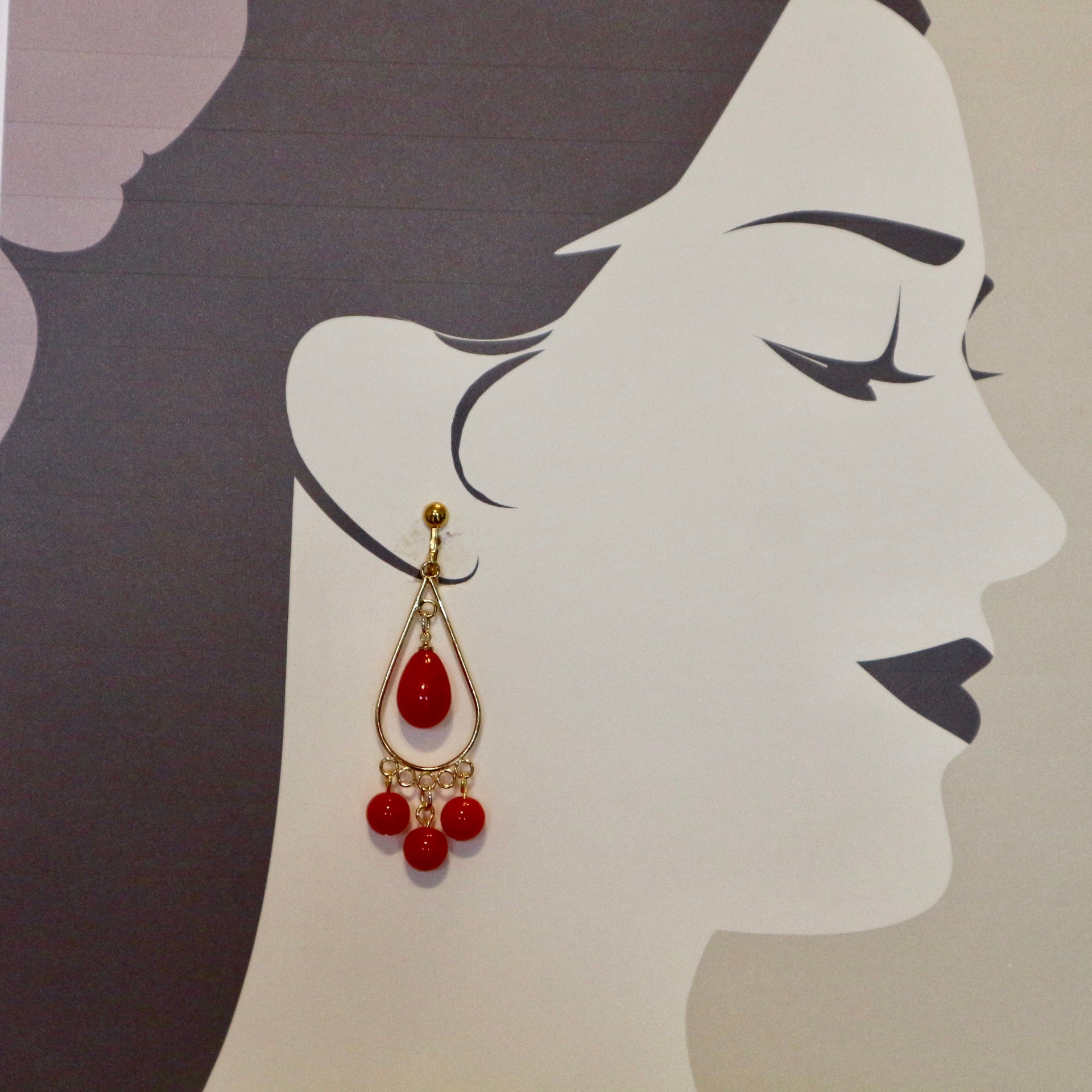 ドロップ型フレームの中に赤いショートドロップ、赤いビーズが揺れるデザインです。