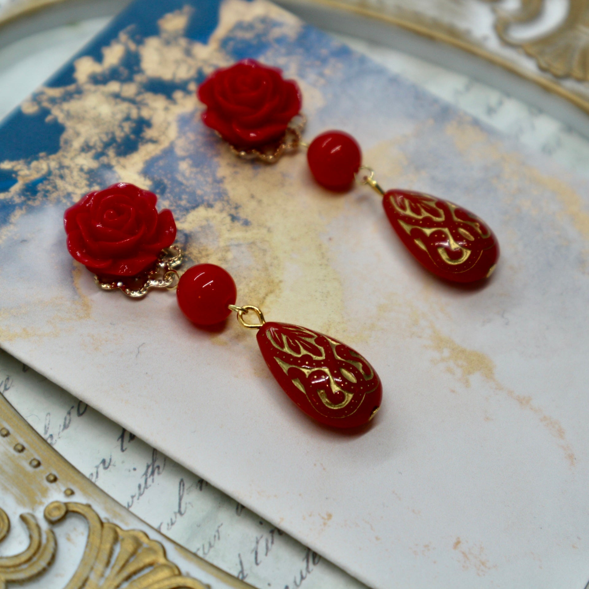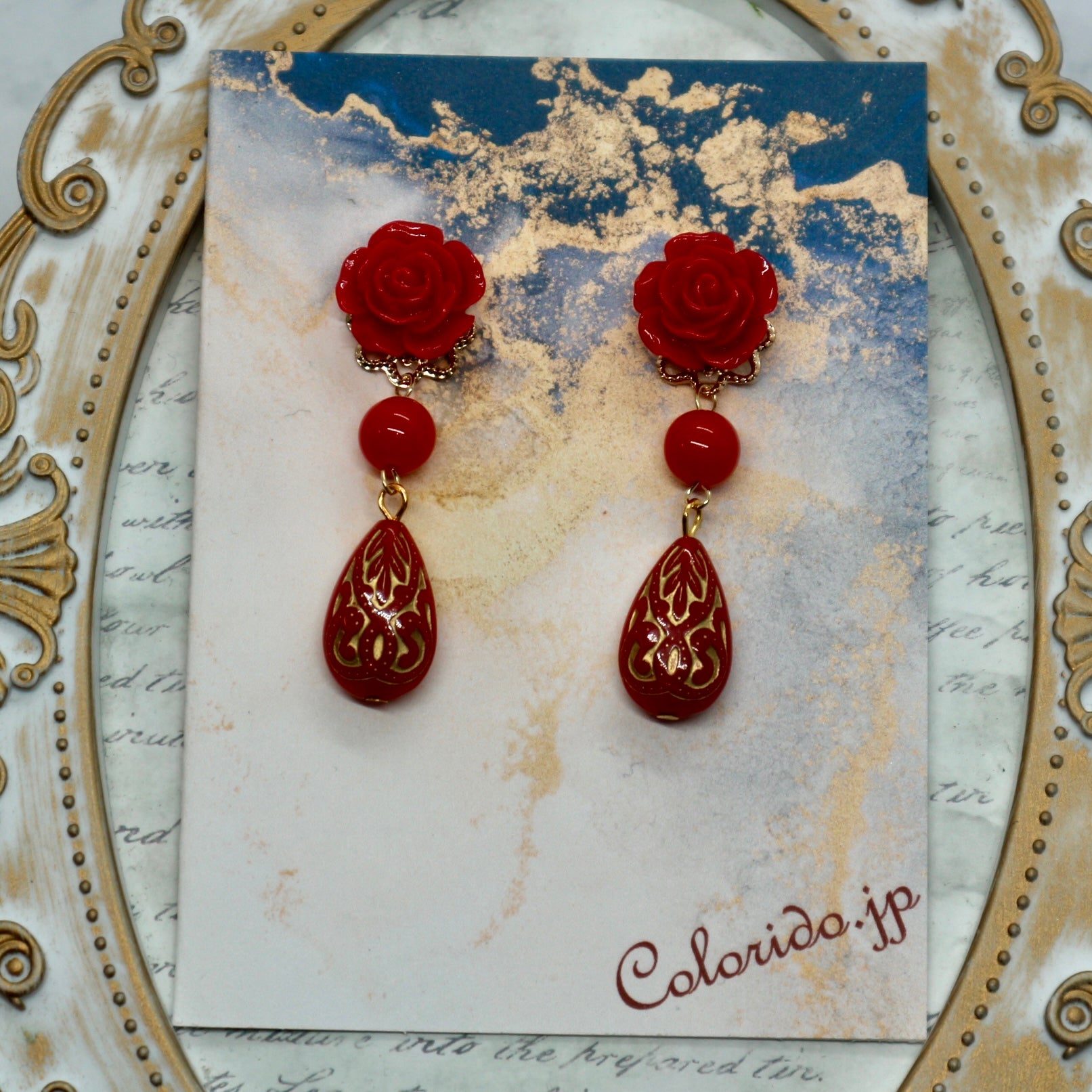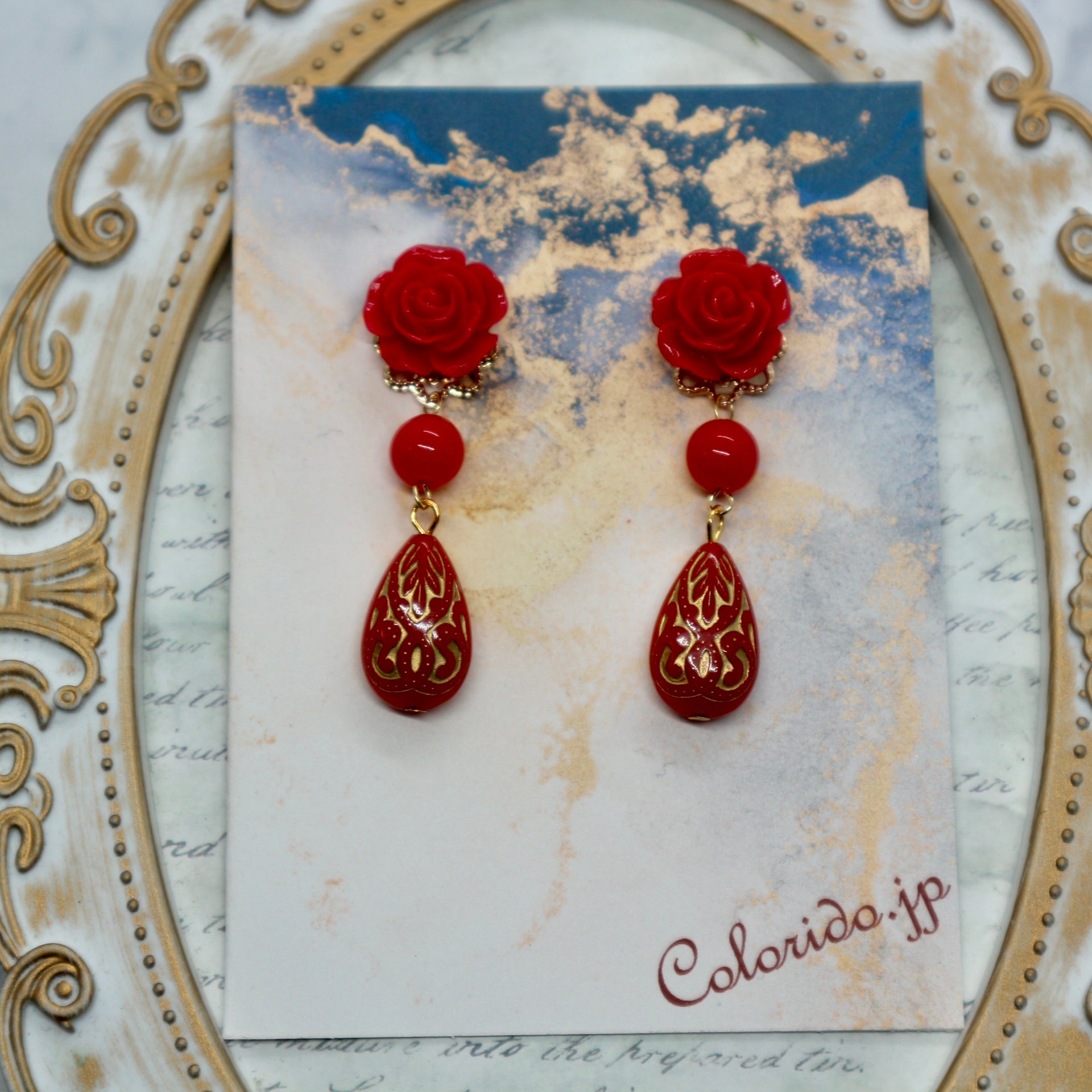 赤のミニ薔薇にアンティーク風ショートドロップを組み合わせたデザインです。