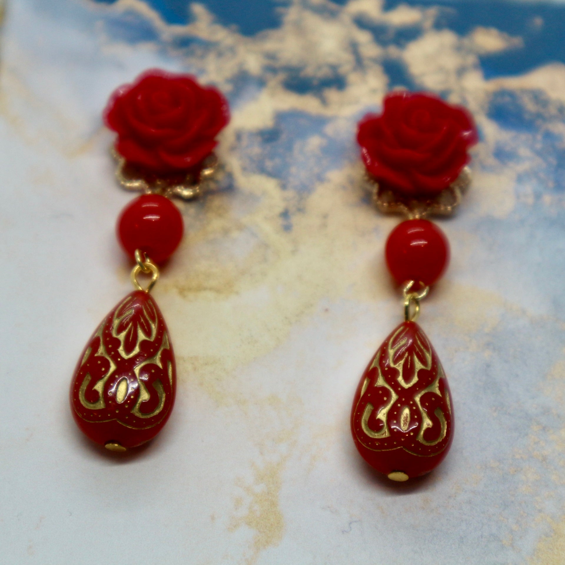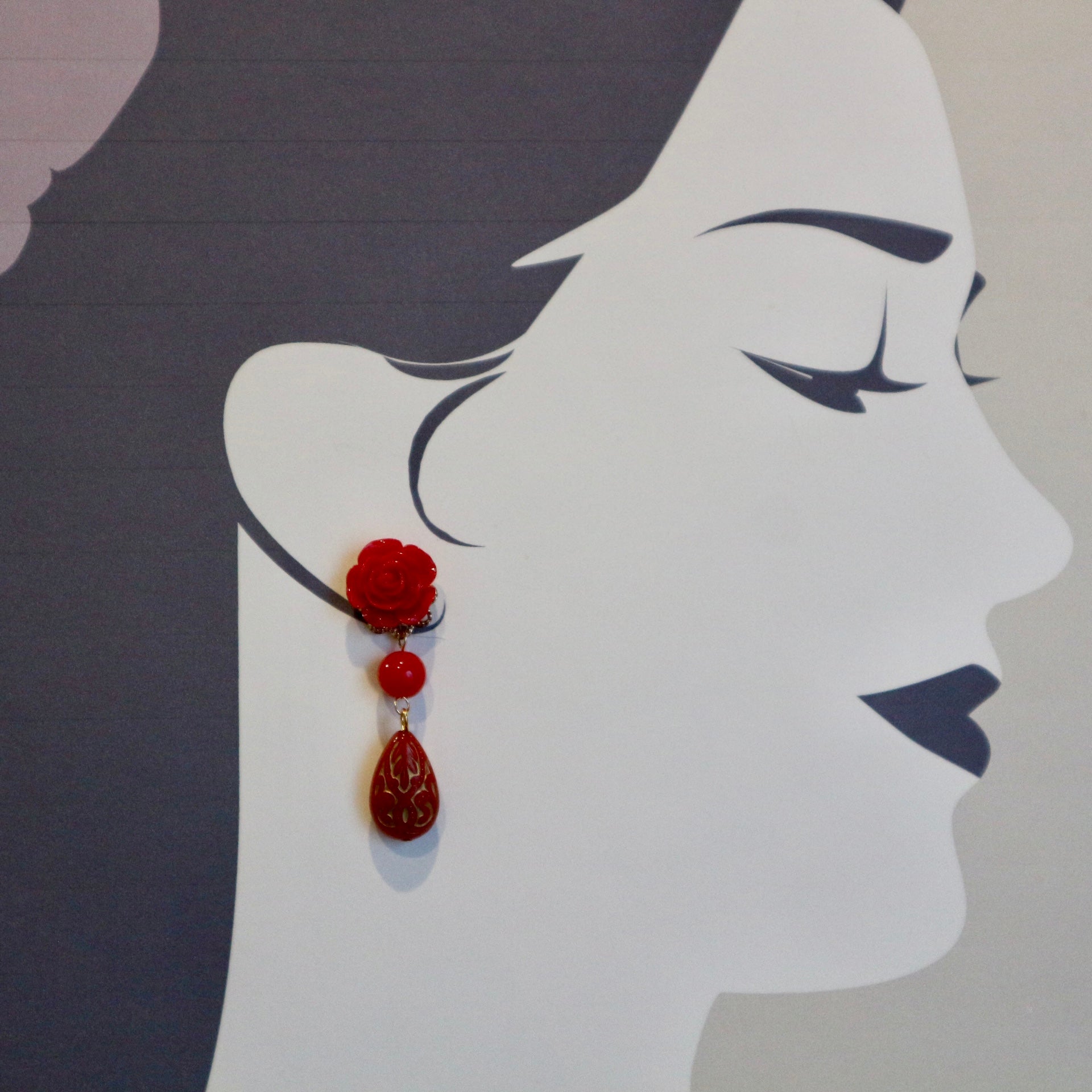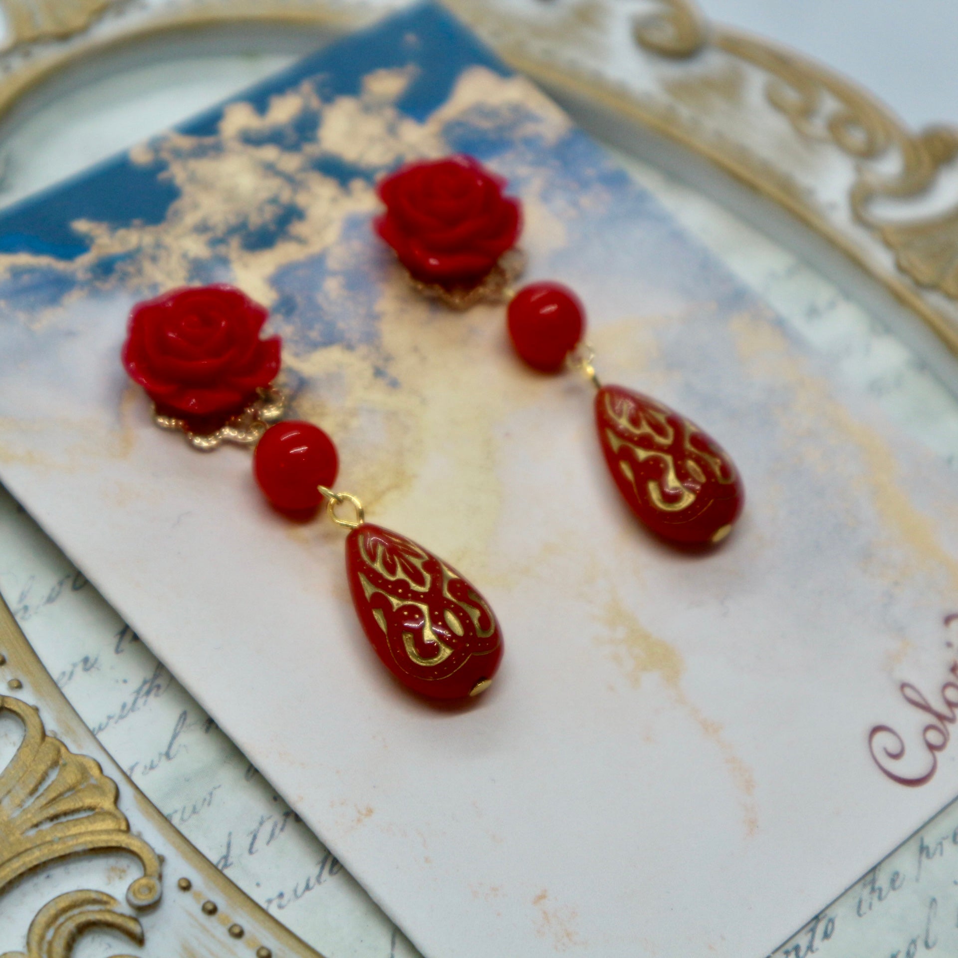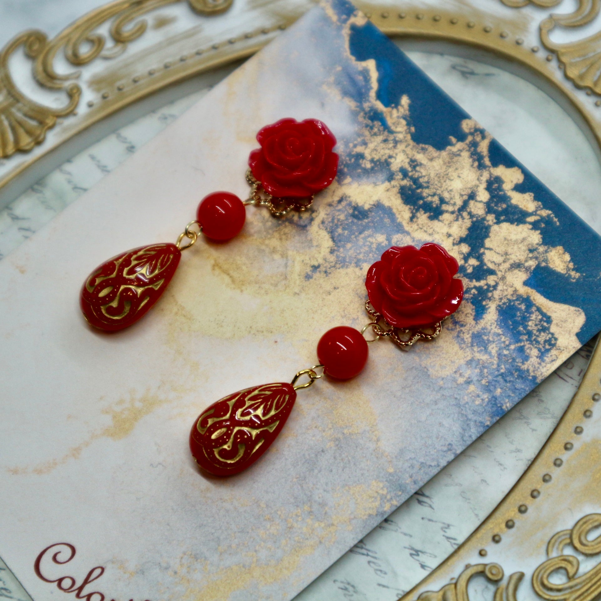 赤のミニ薔薇にアンティーク風ショートドロップを組み合わせたデザインです。