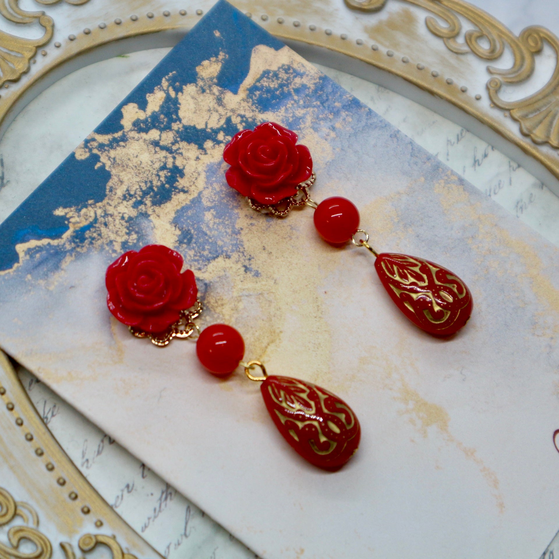 赤い薔薇とアンティーク風ショートドロップのピアス(イヤリング)