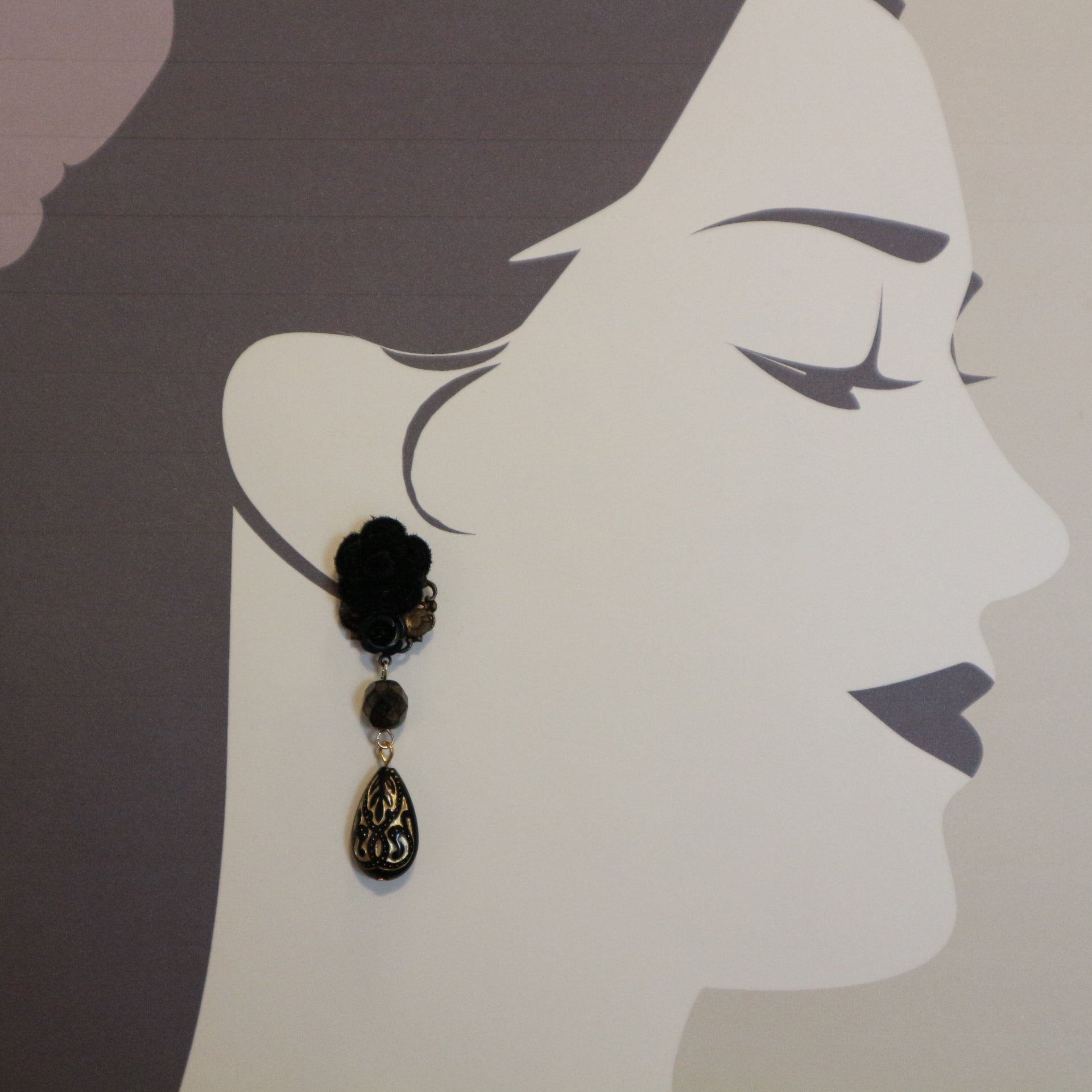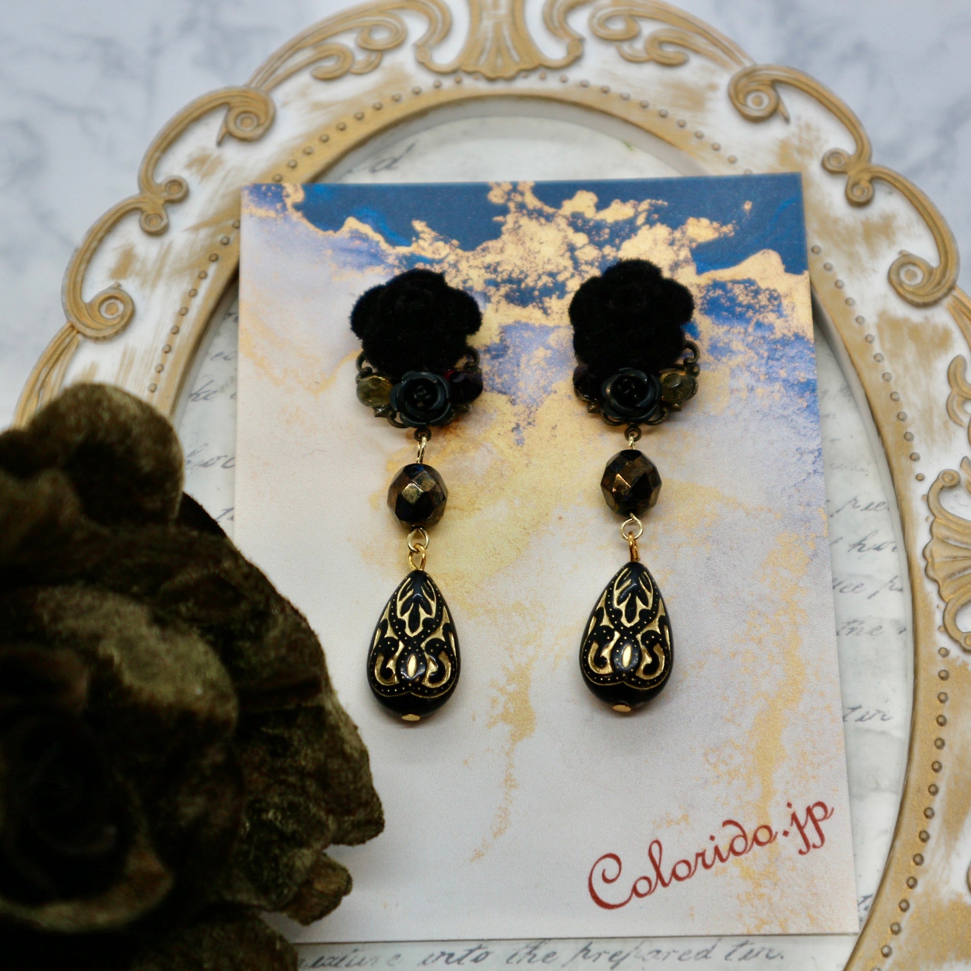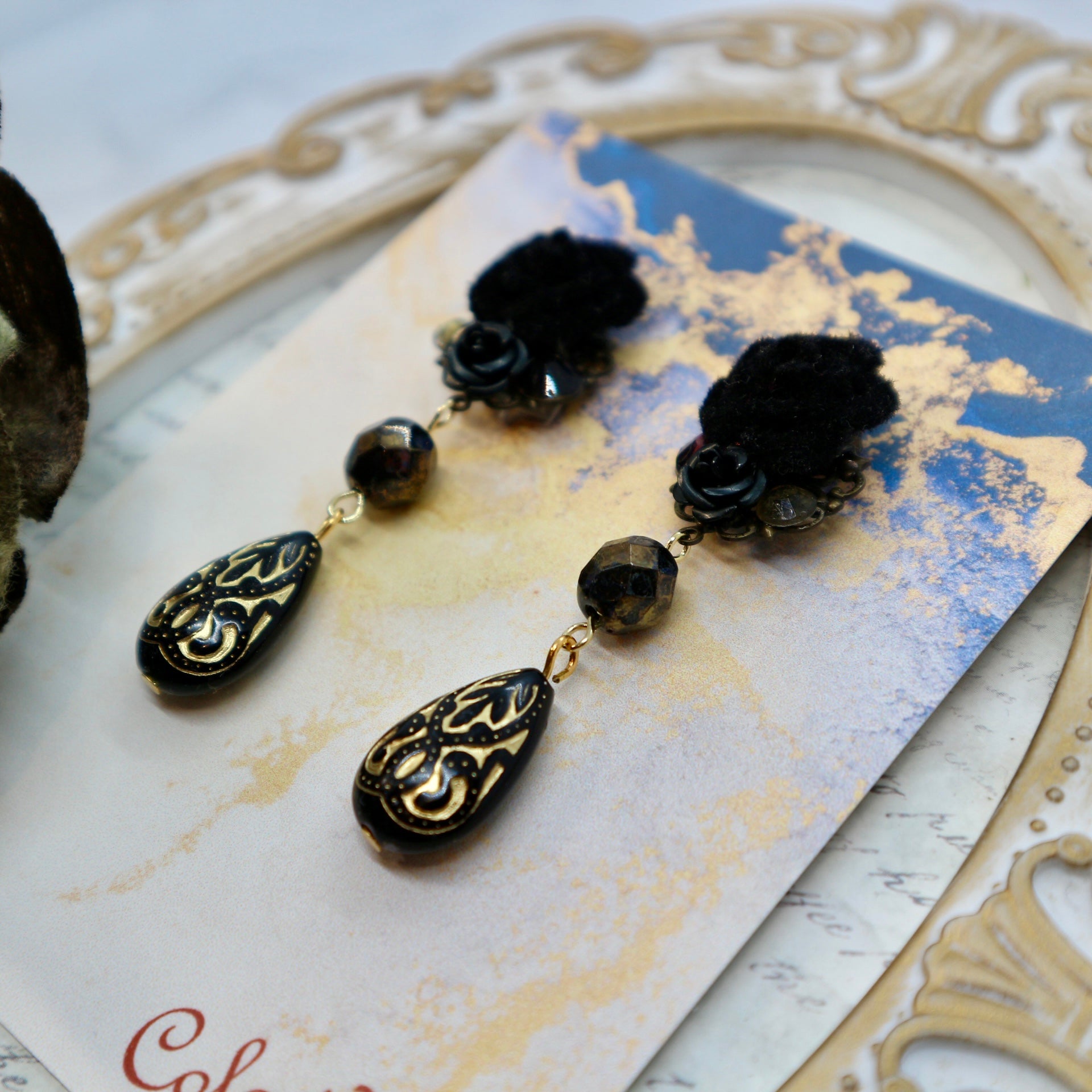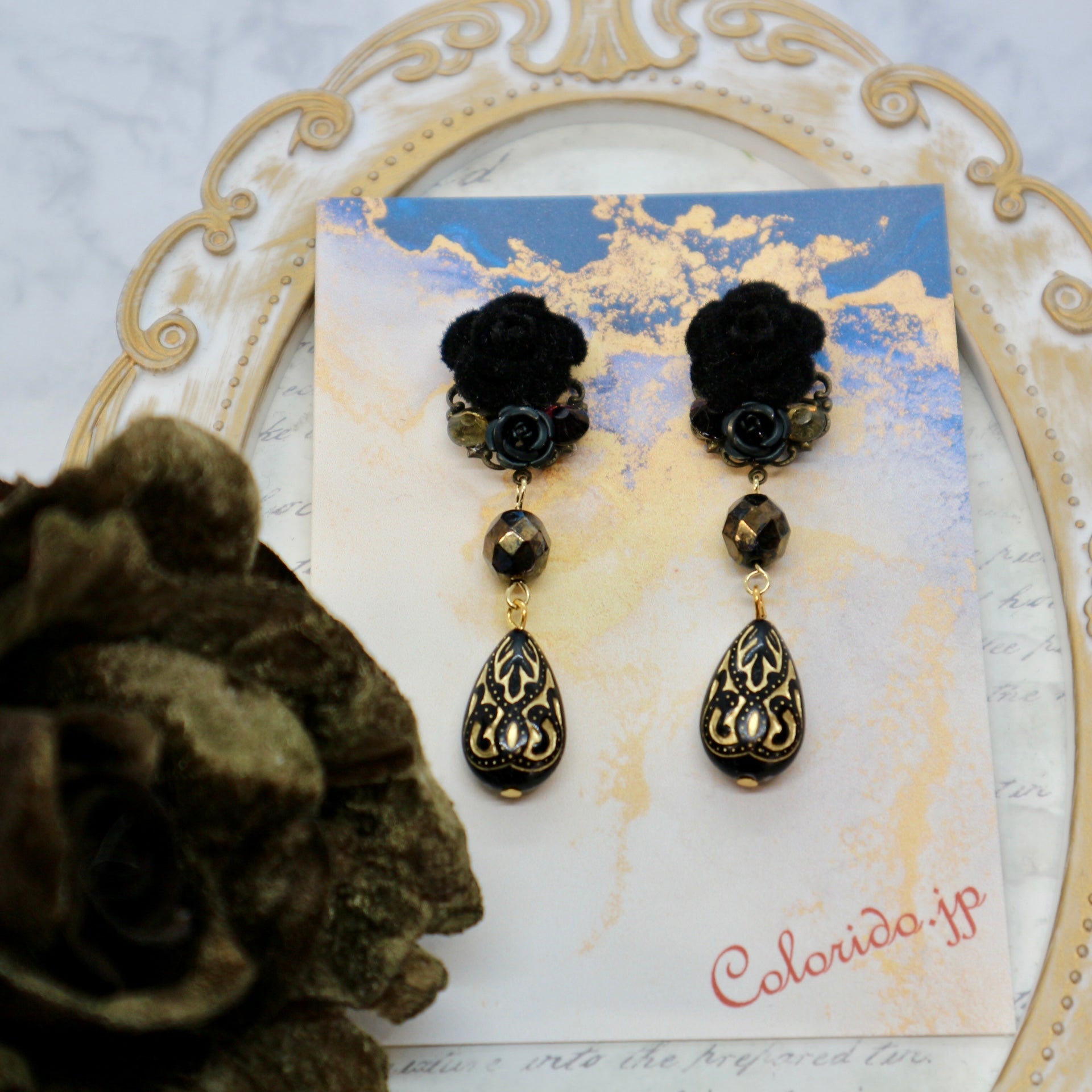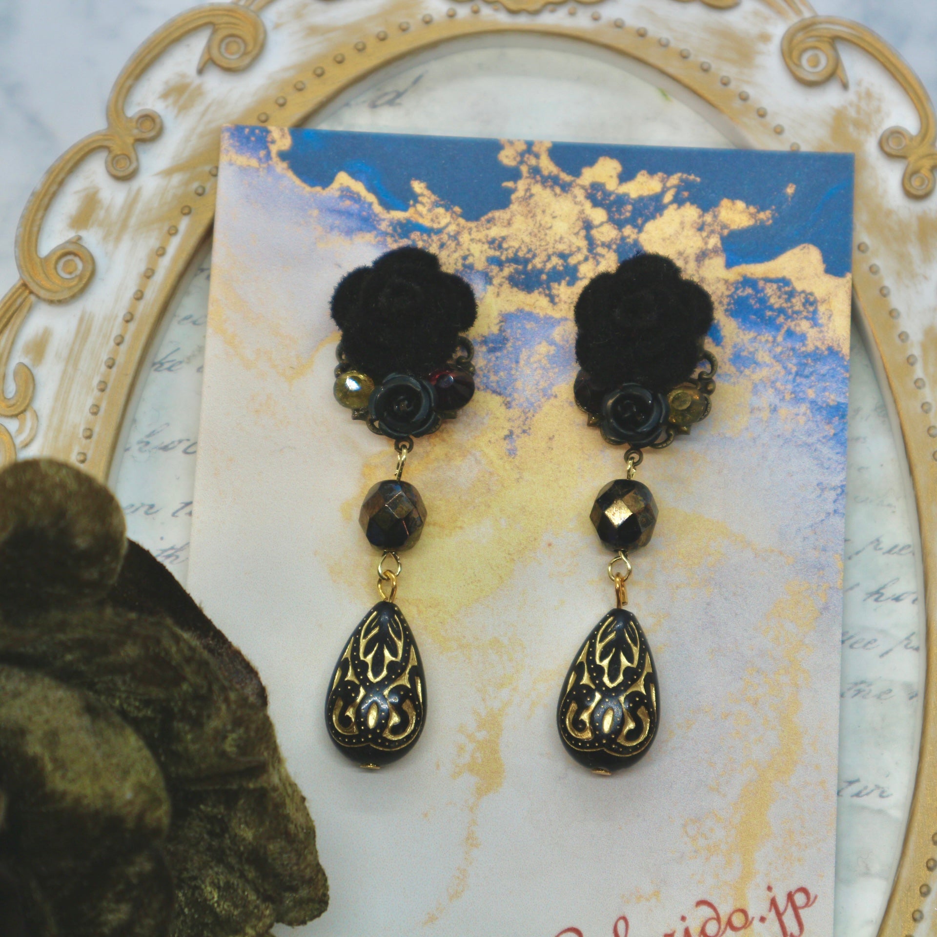 ベロア風の薔薇とドロップのピアス(イヤリング)ブラック