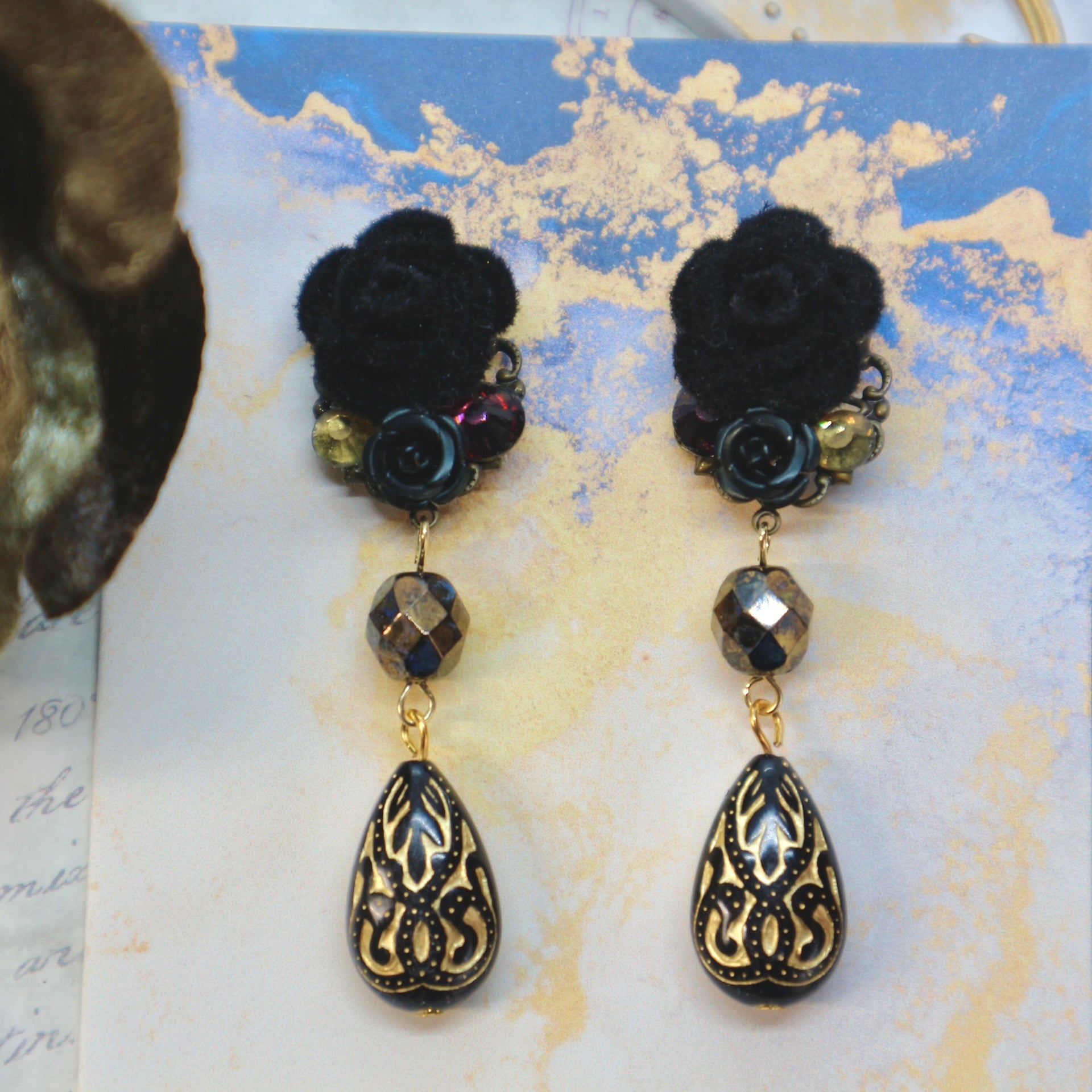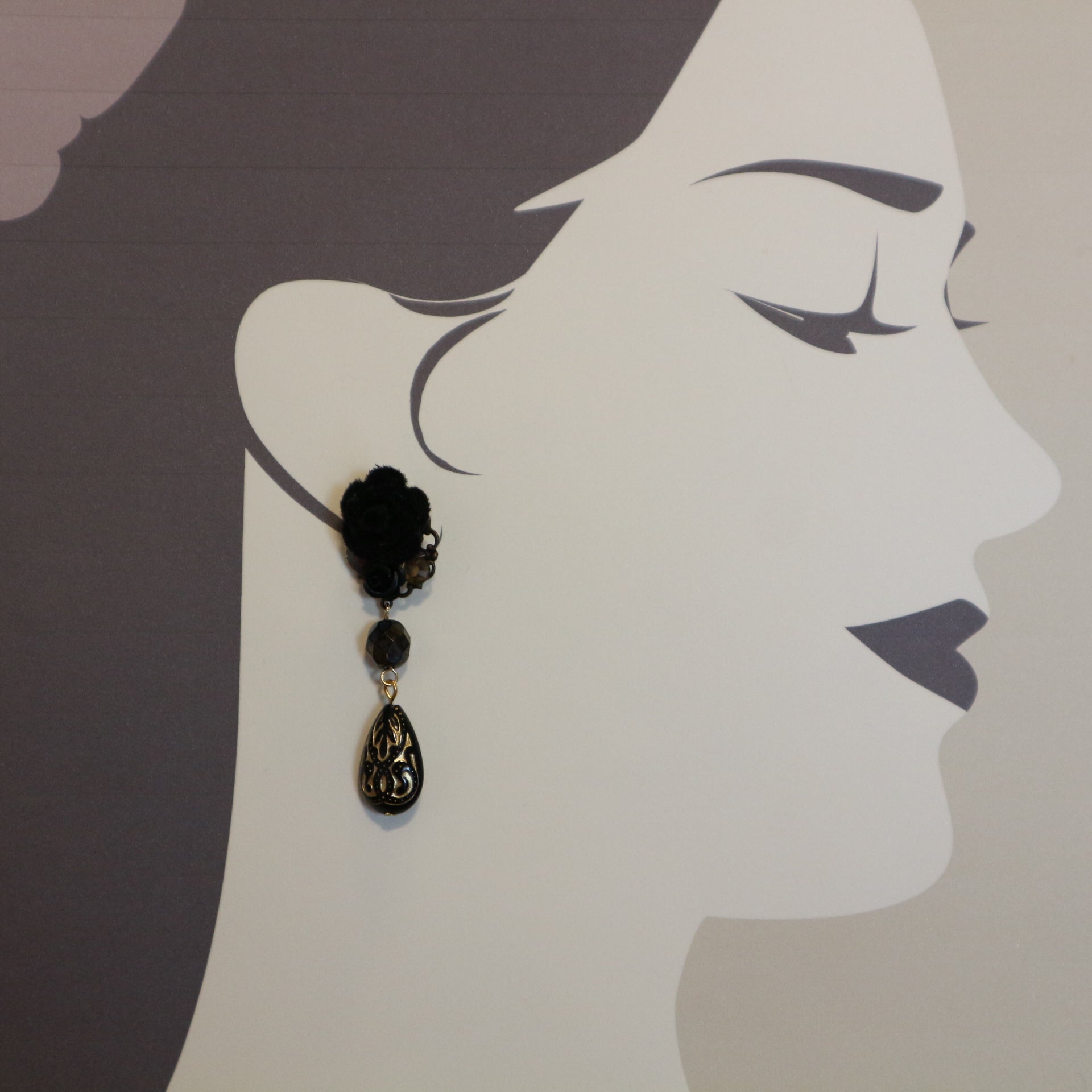 アンティークカラーの透かしに、黒のベロア風薔薇と小さな金属の薔薇を配置しました。キラッと光る黒のガラスビーズとアンティーク調のドロップビーズがエレガントに揺れて、特別な世界観を演出します。