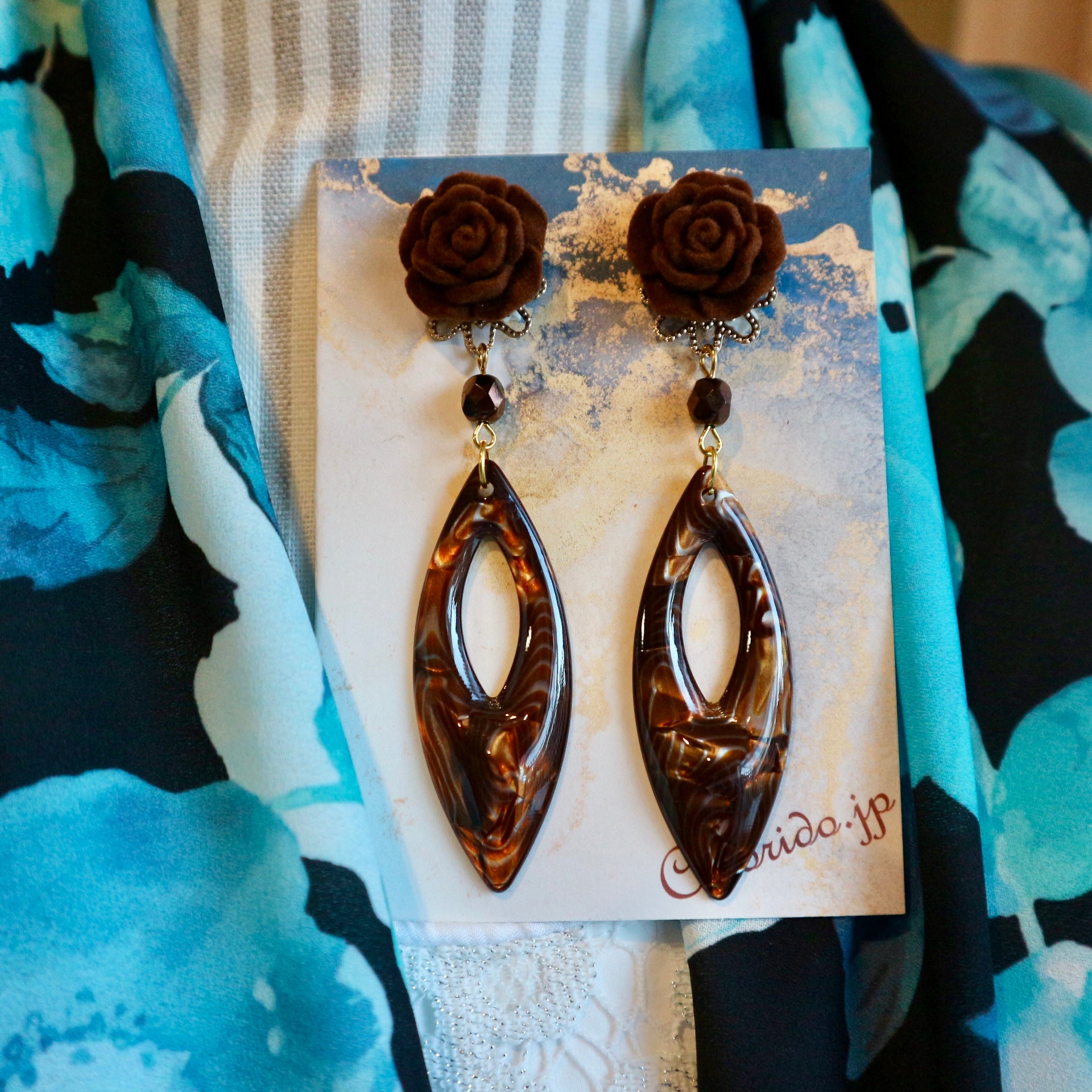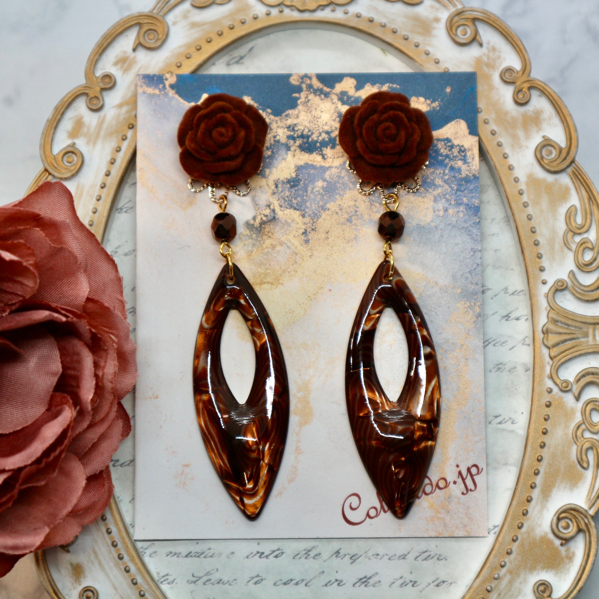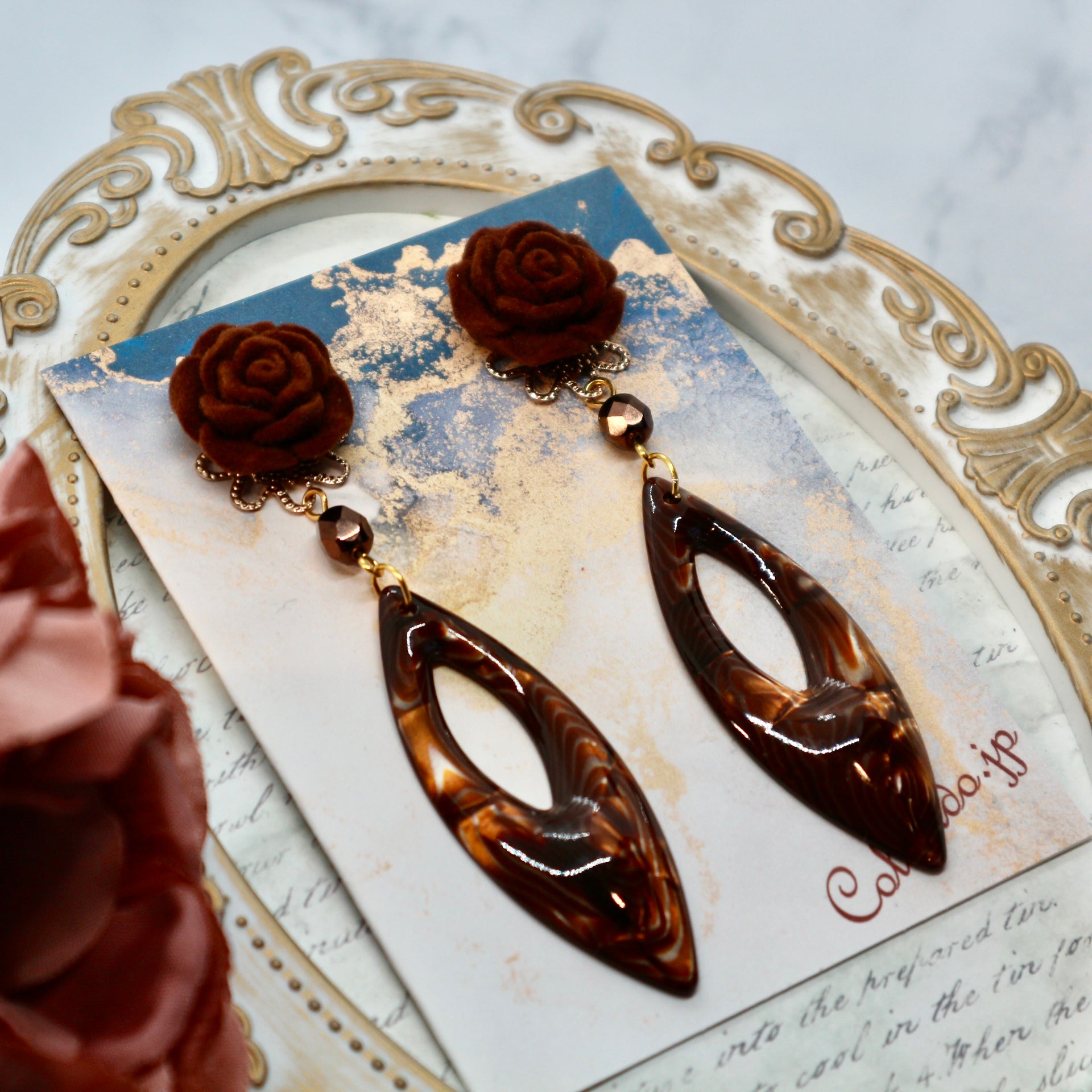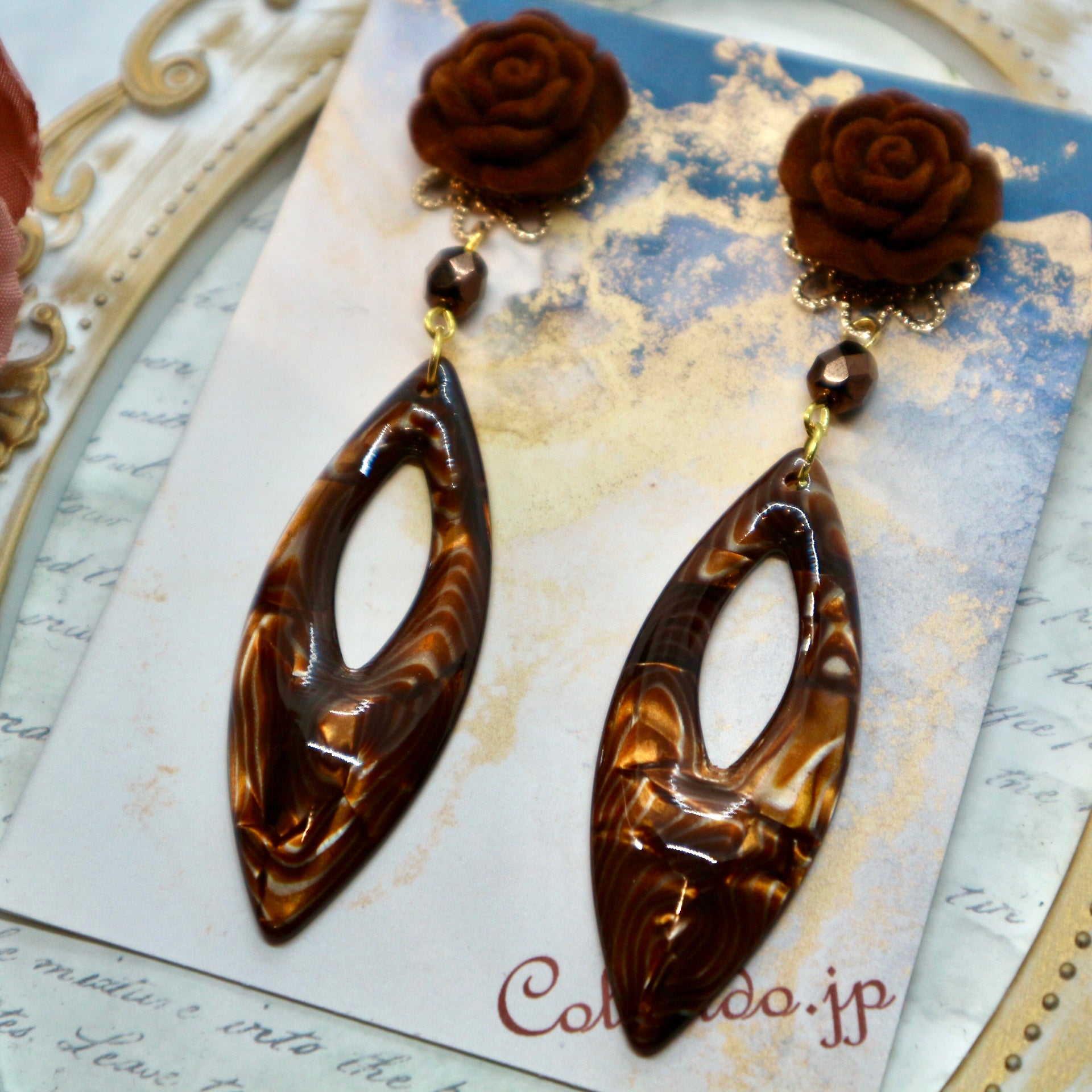 ゴールドの透かしに、チョコレートのようなフロキー薔薇。 ブロンズ色のガラスビーズとマーブル模様のリーフのチャームが揺れるにも、ロングタイプのイヤリングです。