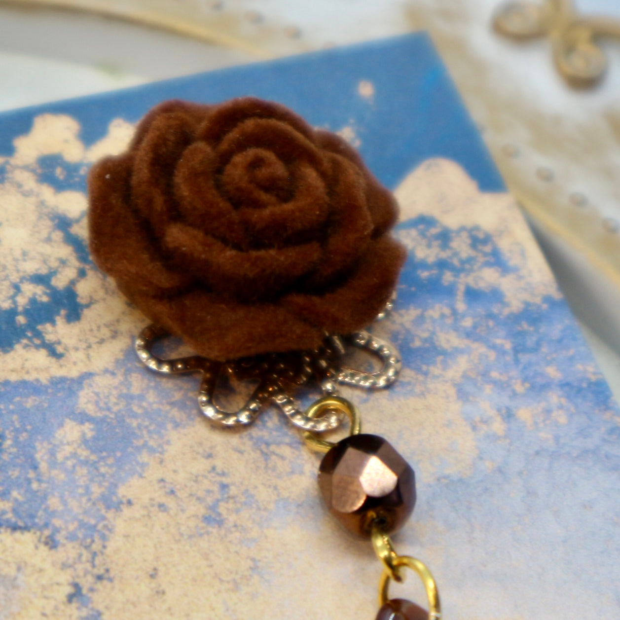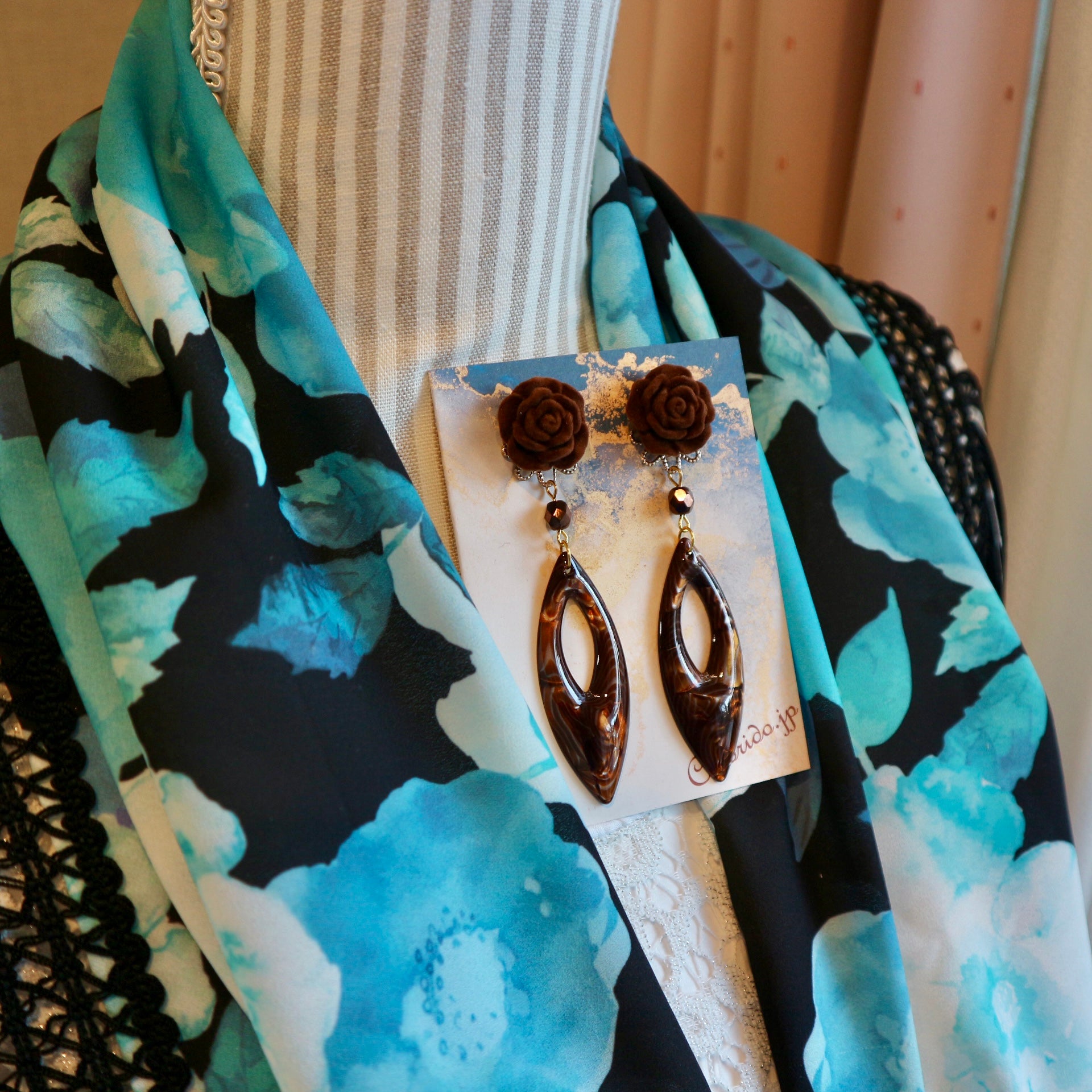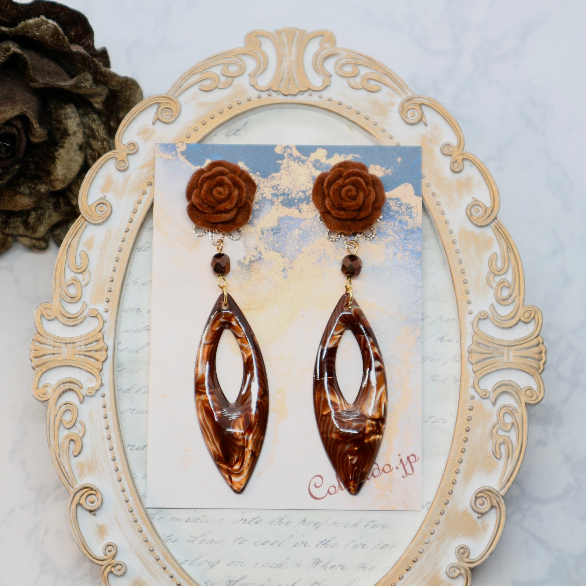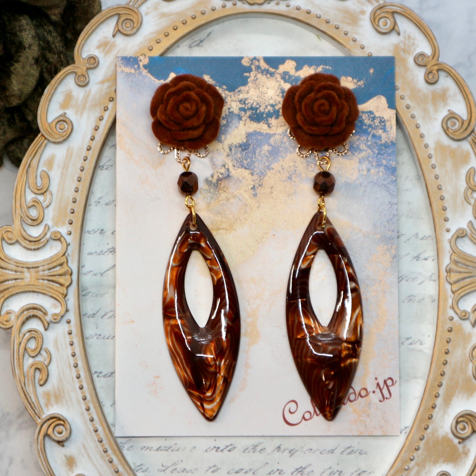 ゴールドの透かしに、チョコレートのようなフロキー薔薇。 ブロンズ色のガラスビーズとマーブル模様のリーフのチャームが揺れるにも、ロングタイプのイヤリングです。