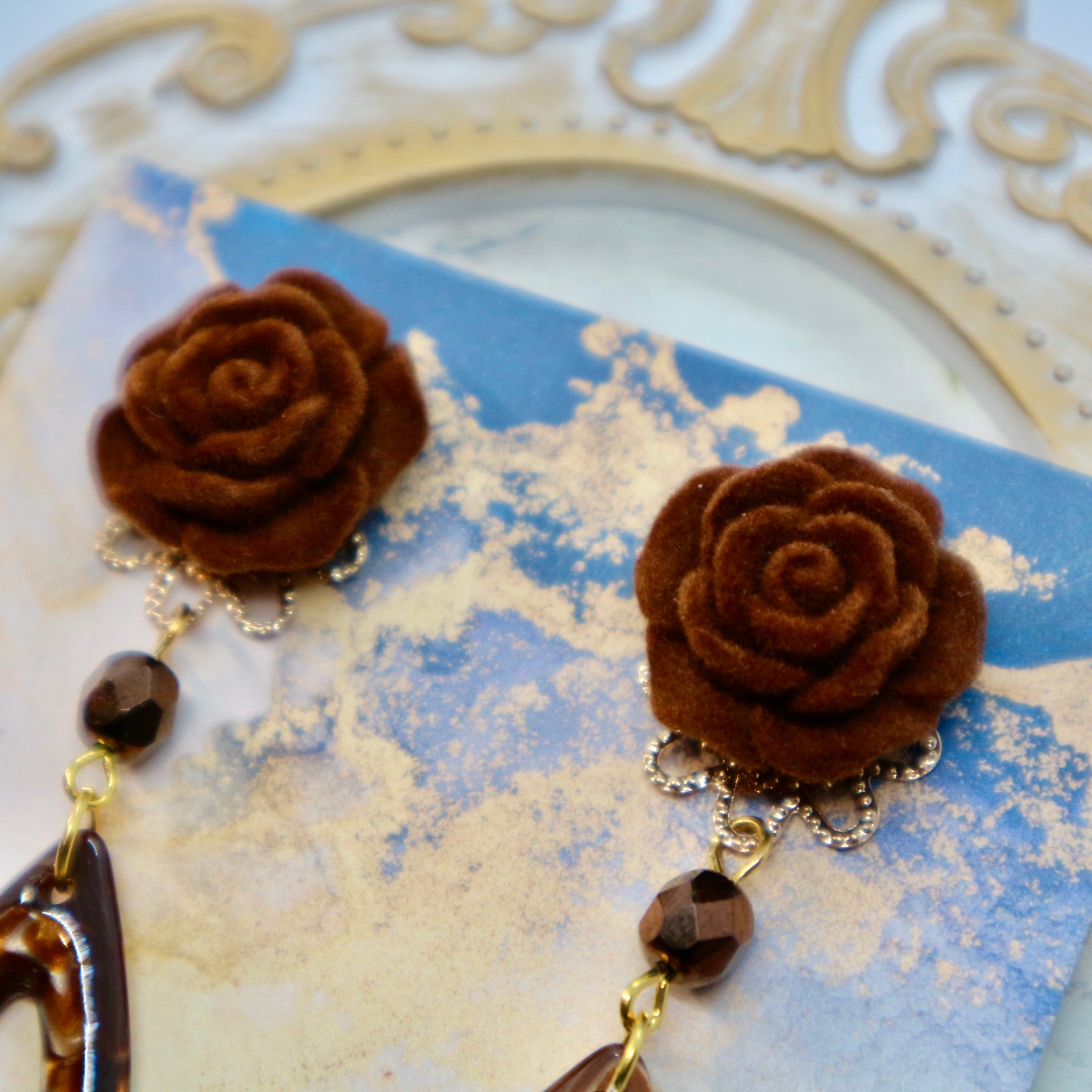 チョコレートカラーの薔薇とリーフのピアス(イヤリング)