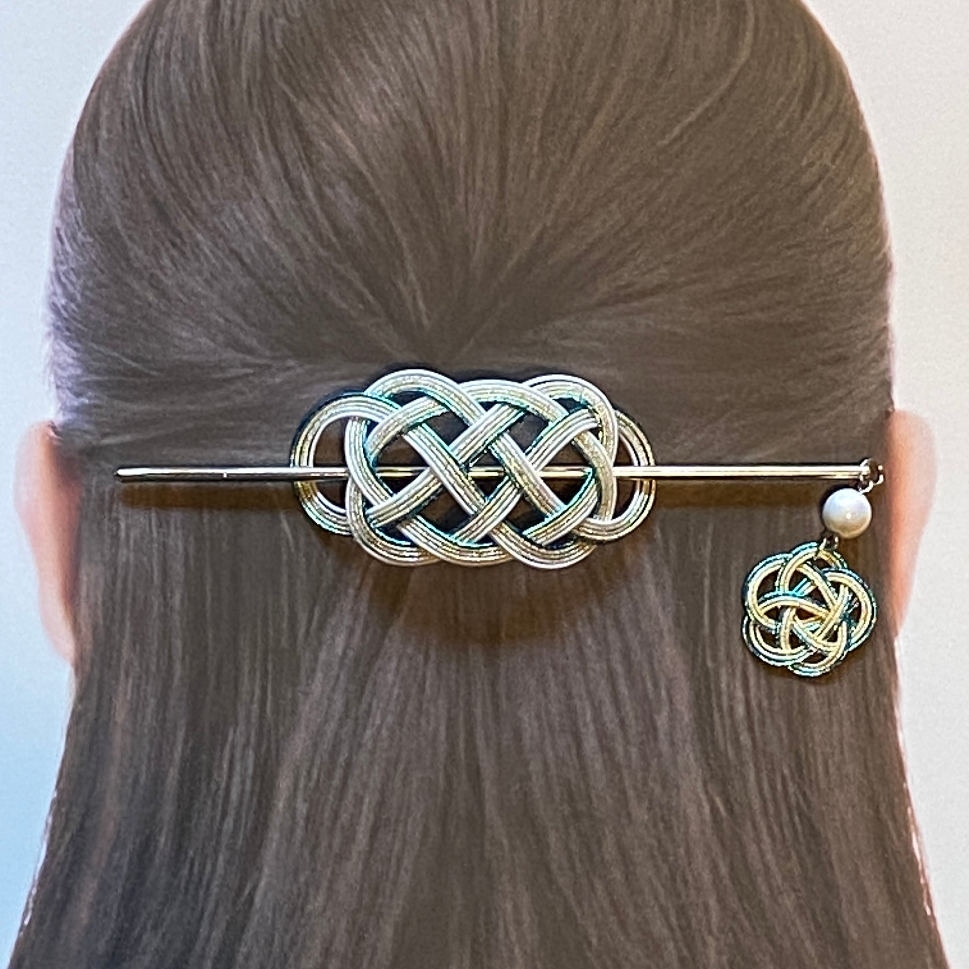 かんざしには、梅結びの水引のチャームとオーロラホワイトのビーズをあしらいました。動くたびにゆらゆら揺れて、うしろ姿をステキに演出します。気軽な和装や浴衣の装いにぴったりですが、普段着のおしゃれに合わせてみてはいかがでしょうか。