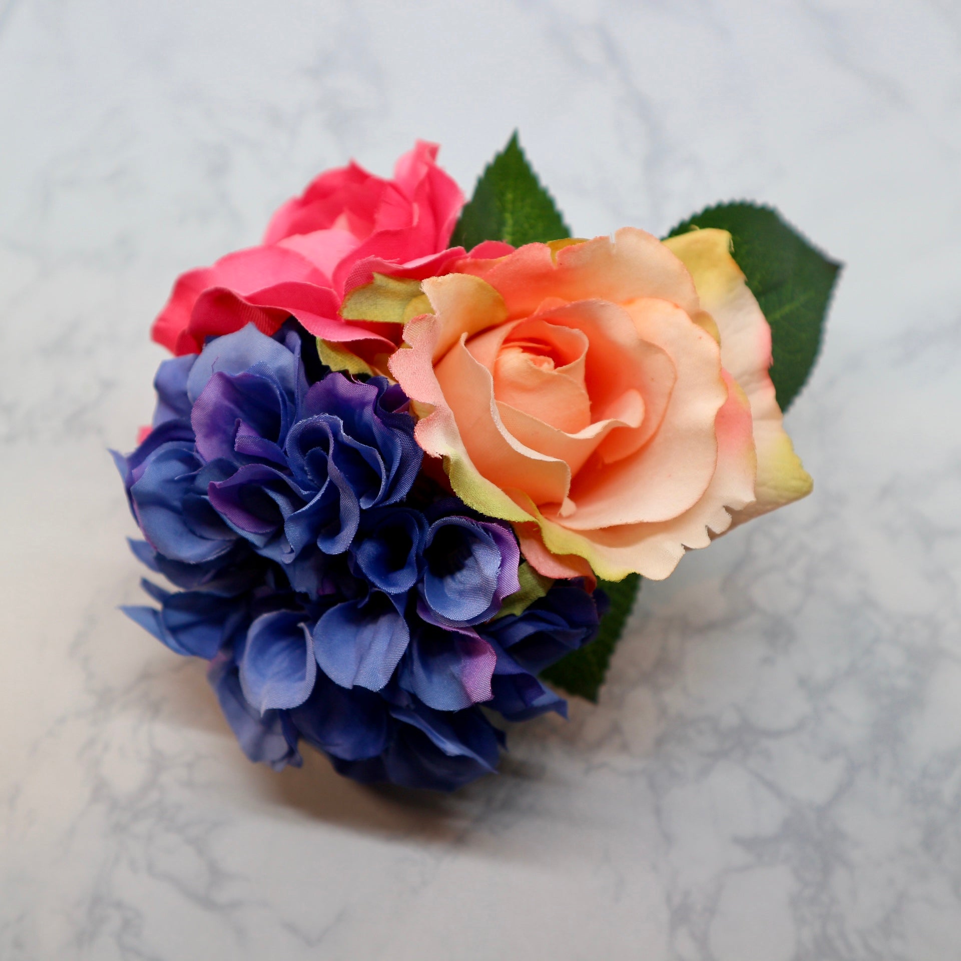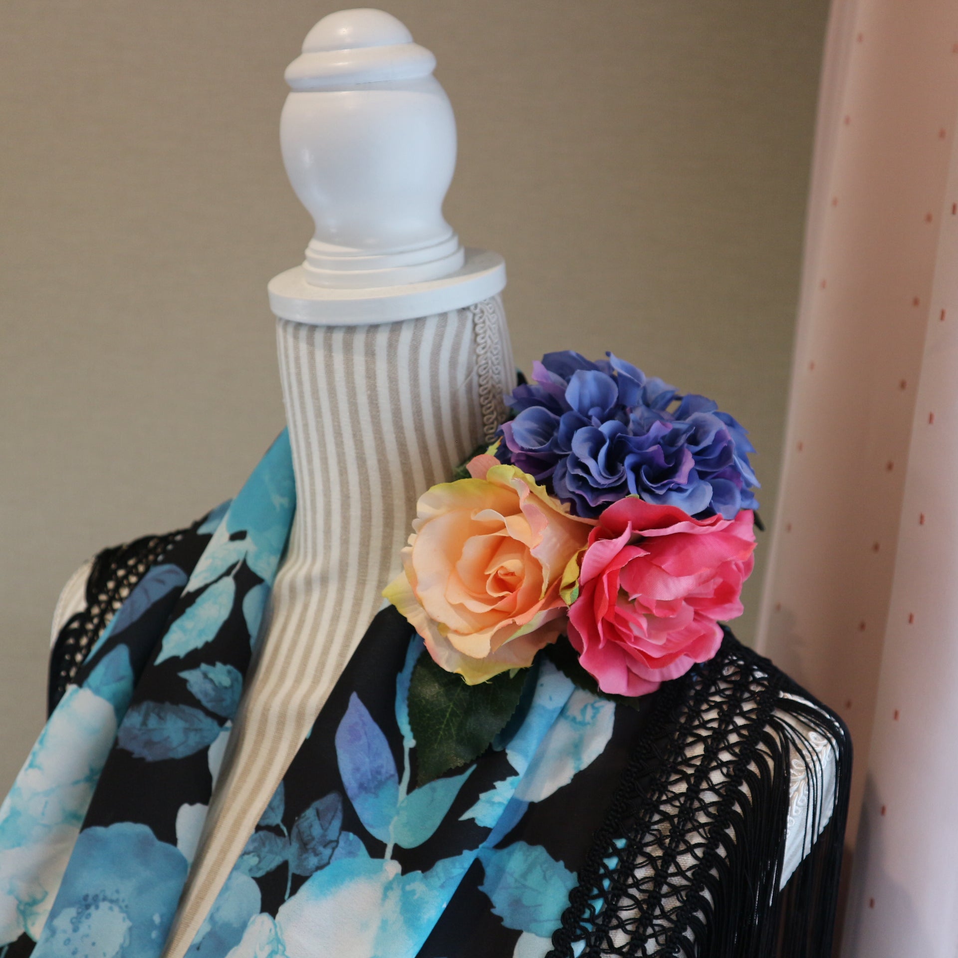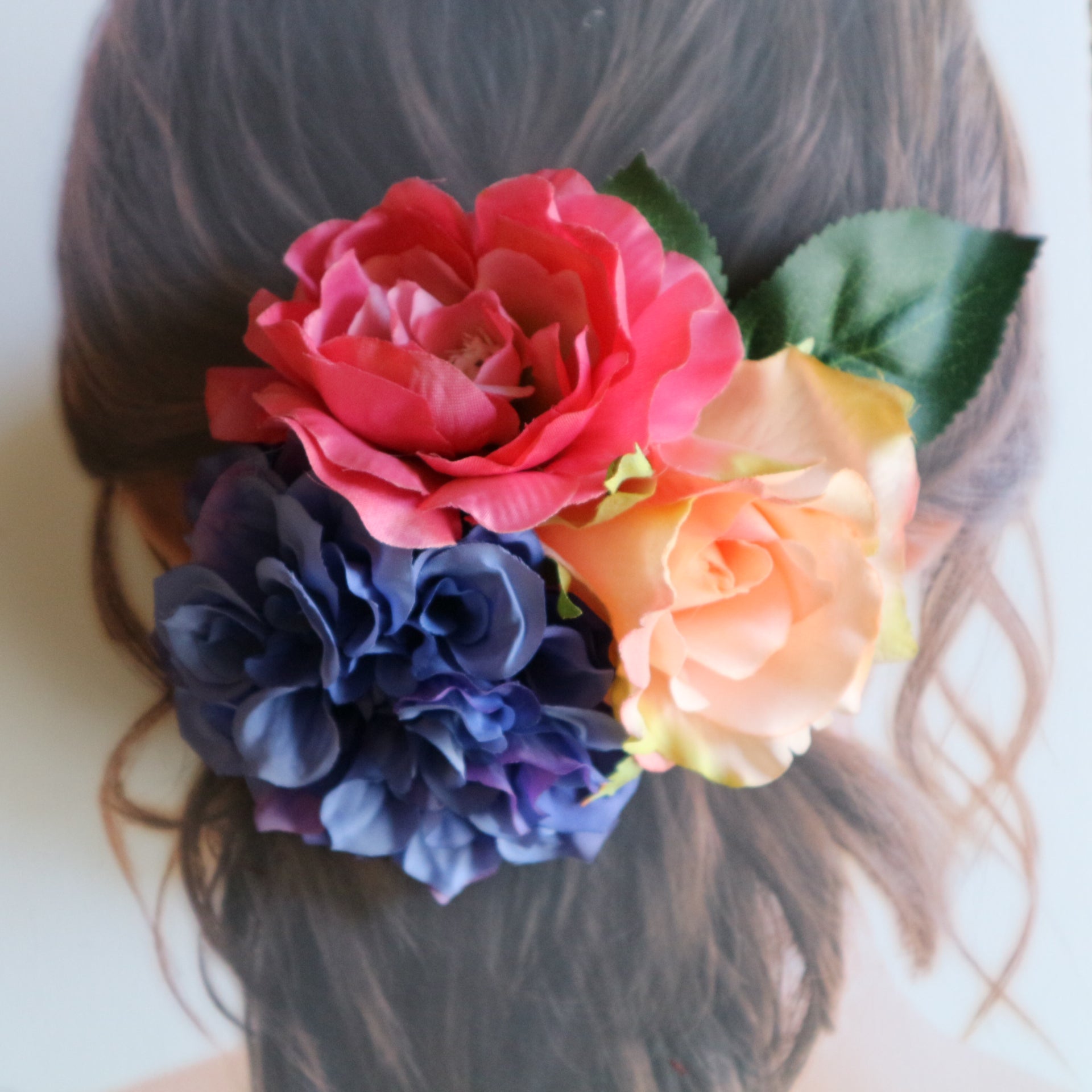 淡いピンクの薔薇、ピンクのラナンキュラス、青紫のダリヤの組み合わせでブーケスタイルにアレンジしたフラメンコ向けの花飾り(フローレス)です。