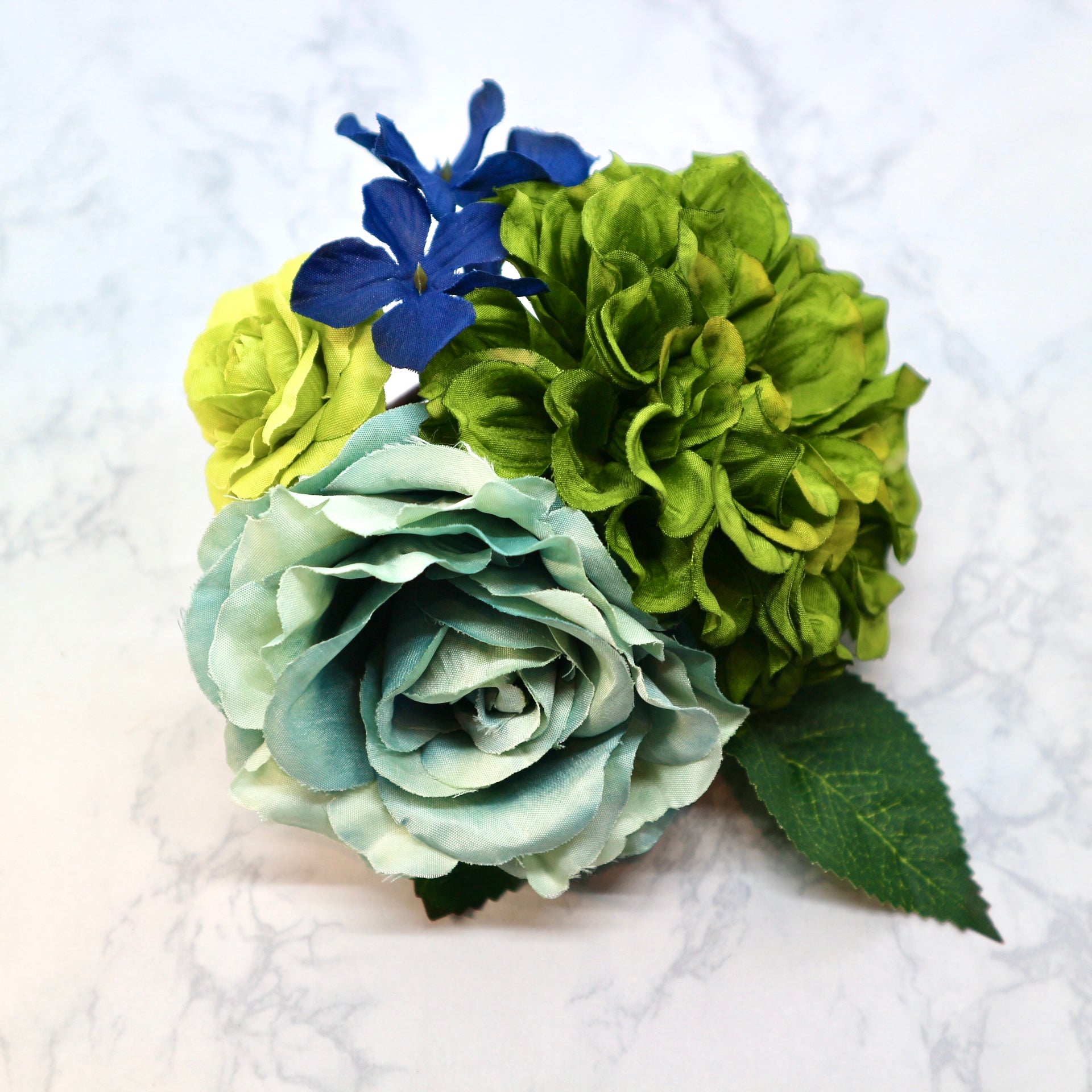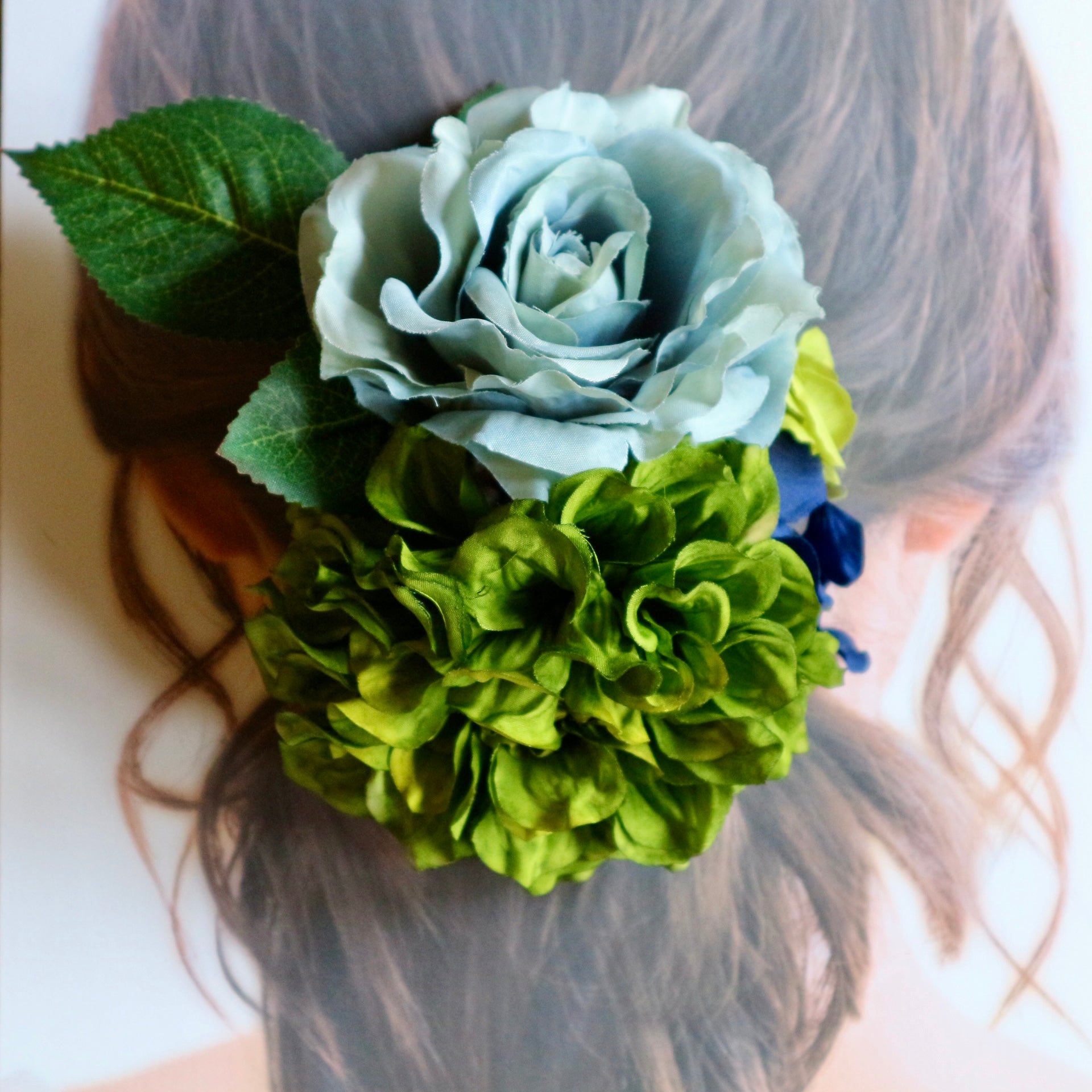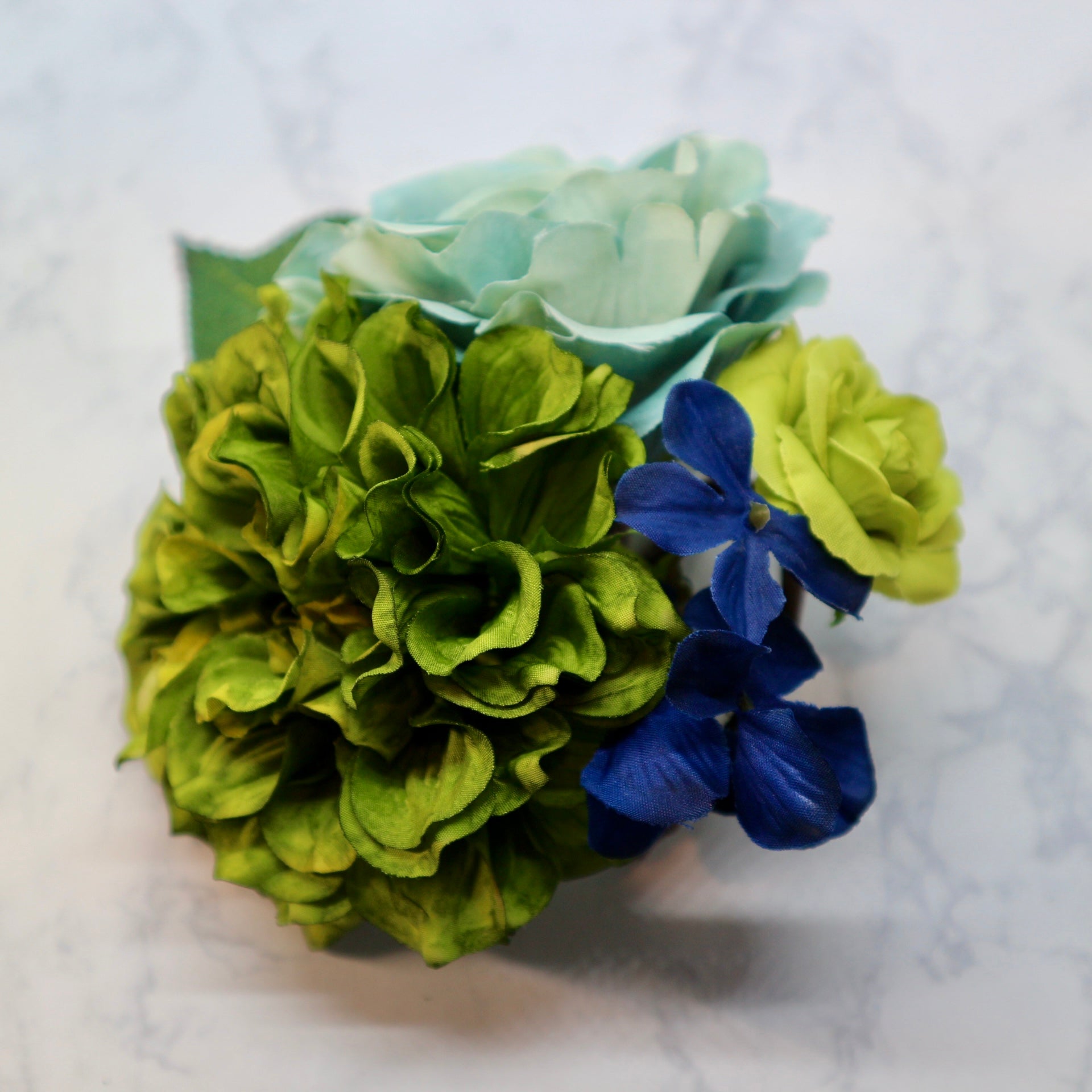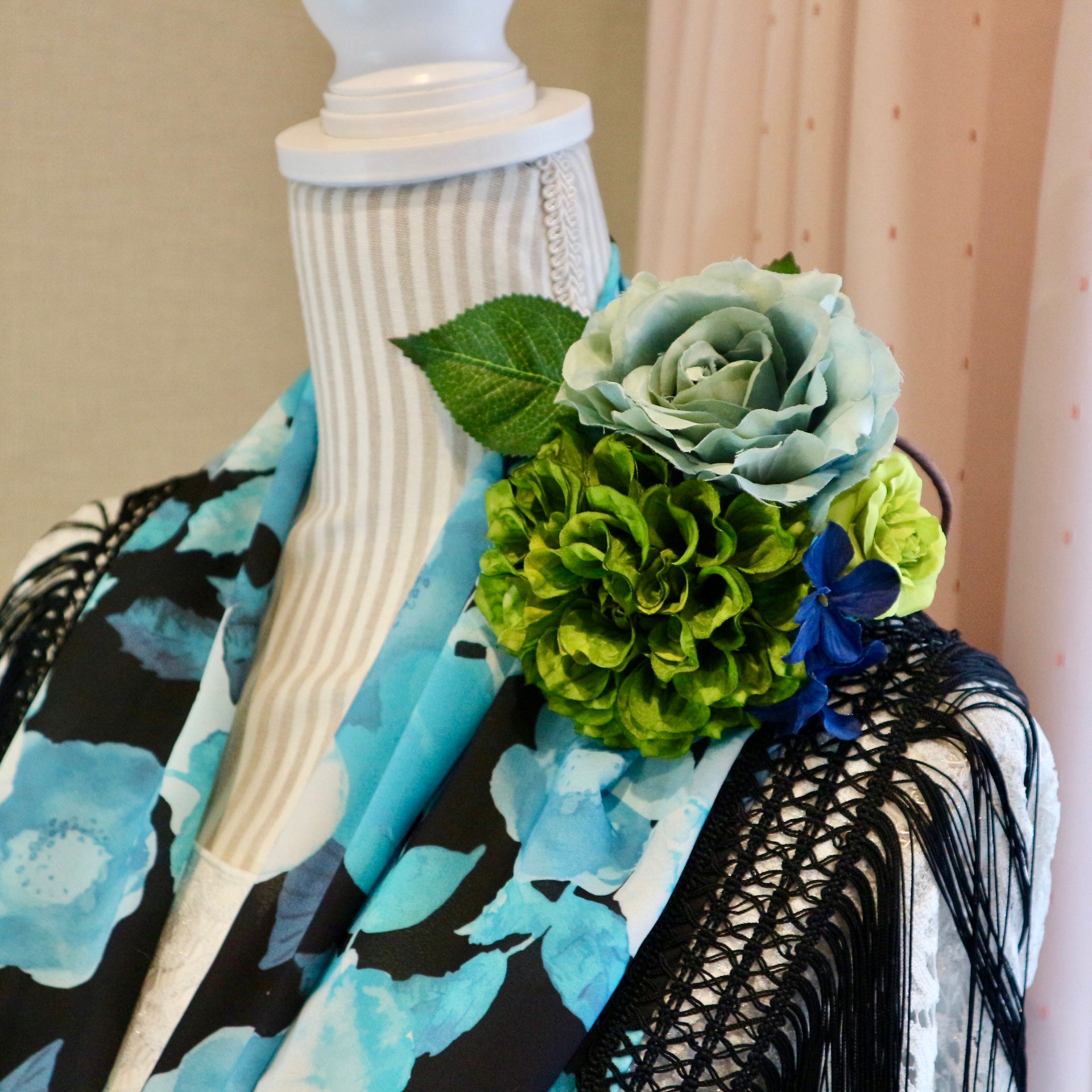 イエローグリーンの大輪ダリヤ、ブルーグレーの薔薇、ライトグリーンのミニ薔薇、濃紺のアジサイの組み合わせでブーケスタイルにアレンジしたフラメンコ向けの花飾り(フローレス)です。 やわらかいワイヤーを使っていますので、お花を一列に並べる等、お花の位置は自由に動かすことができます。