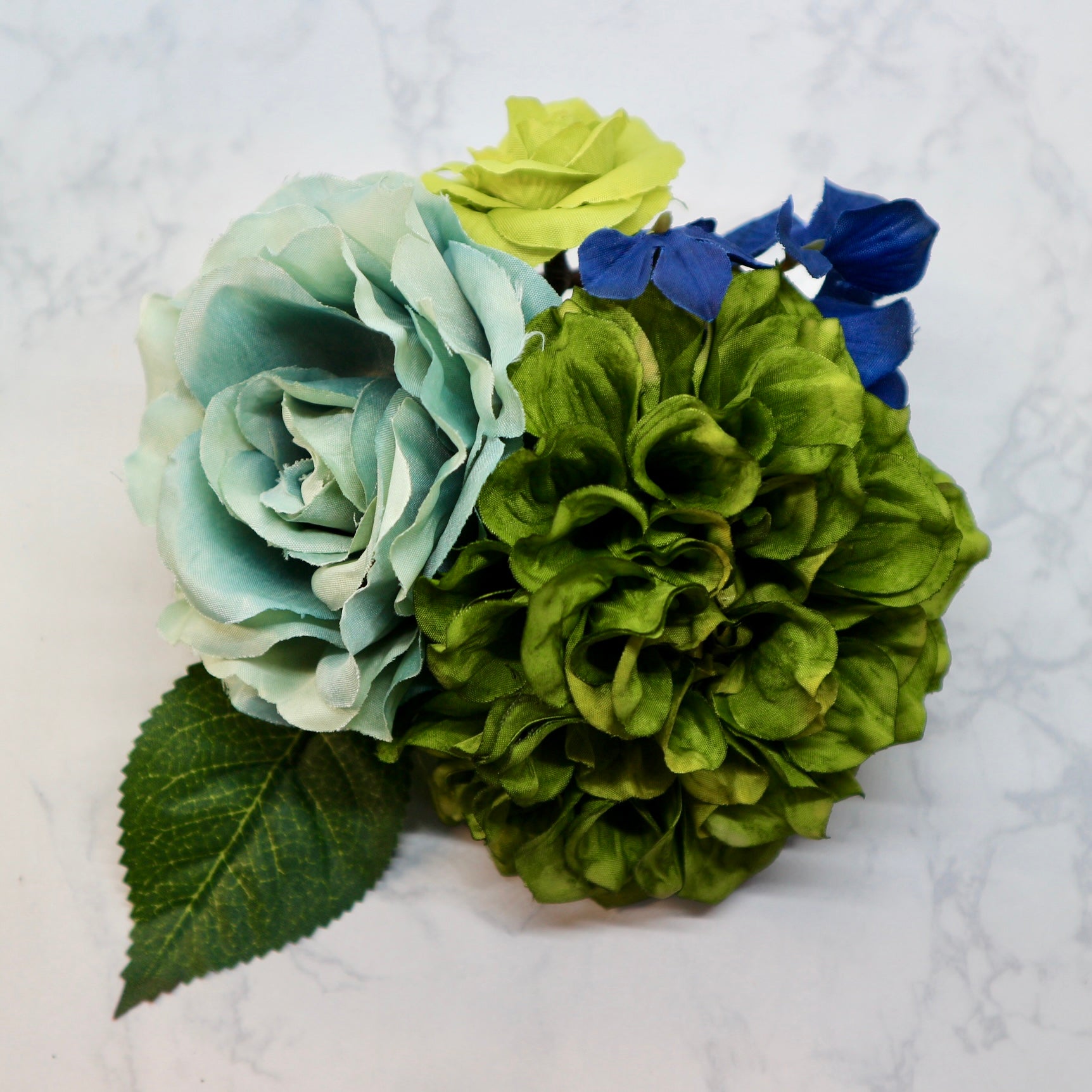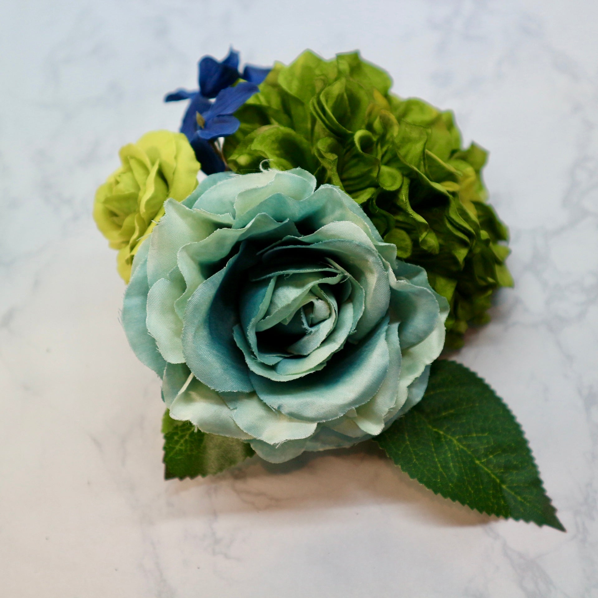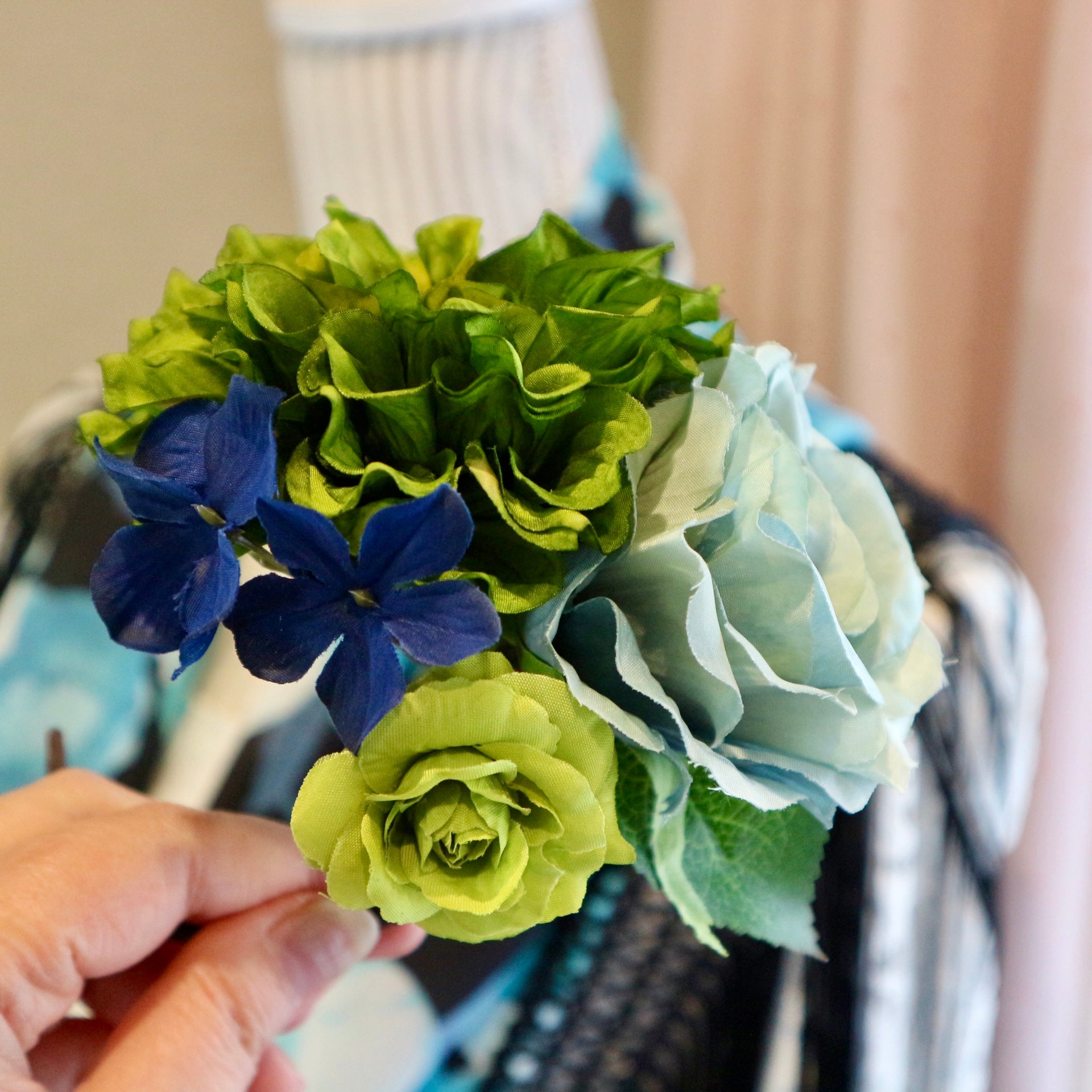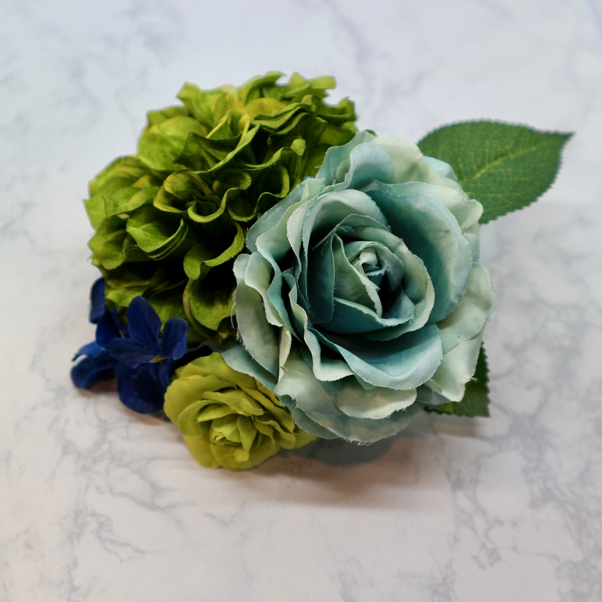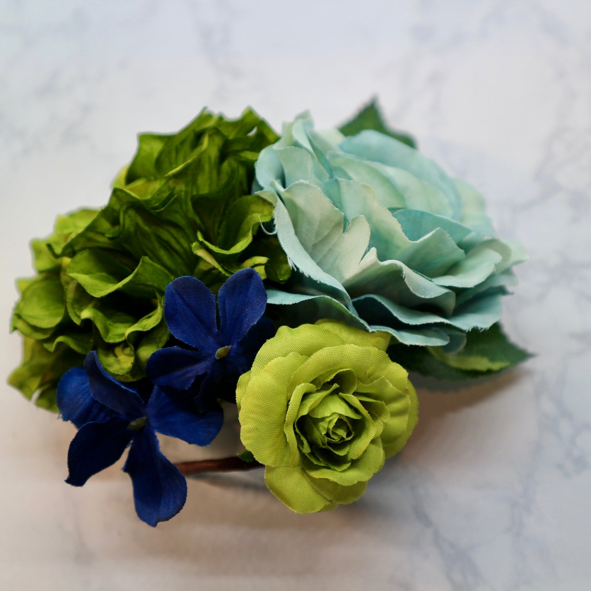 イエローグリーンの大輪ダリヤ、ブルーグレーの薔薇、ライトグリーンのミニ薔薇、濃紺のアジサイの組み合わせでブーケスタイルにアレンジしたフラメンコ向けの花飾り(フローレス)です。 やわらかいワイヤーを使っていますので、お花を一列に並べる等、お花の位置は自由に動かすことができます。