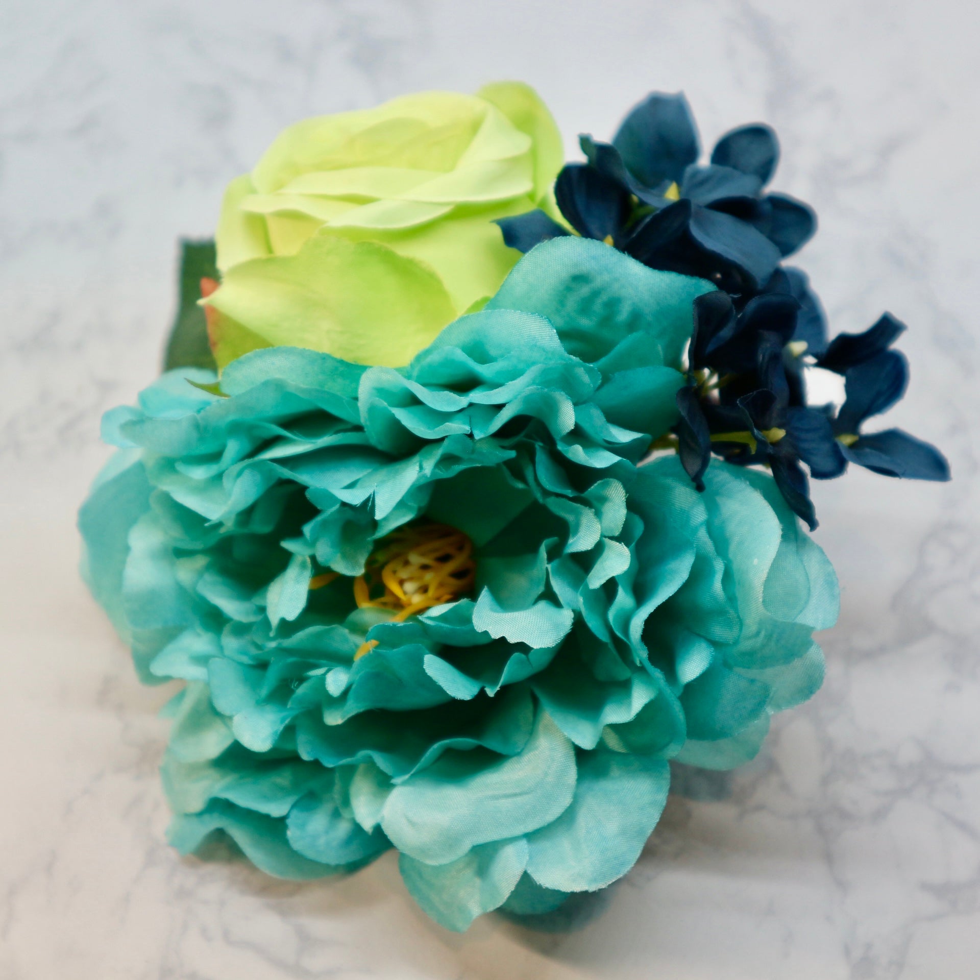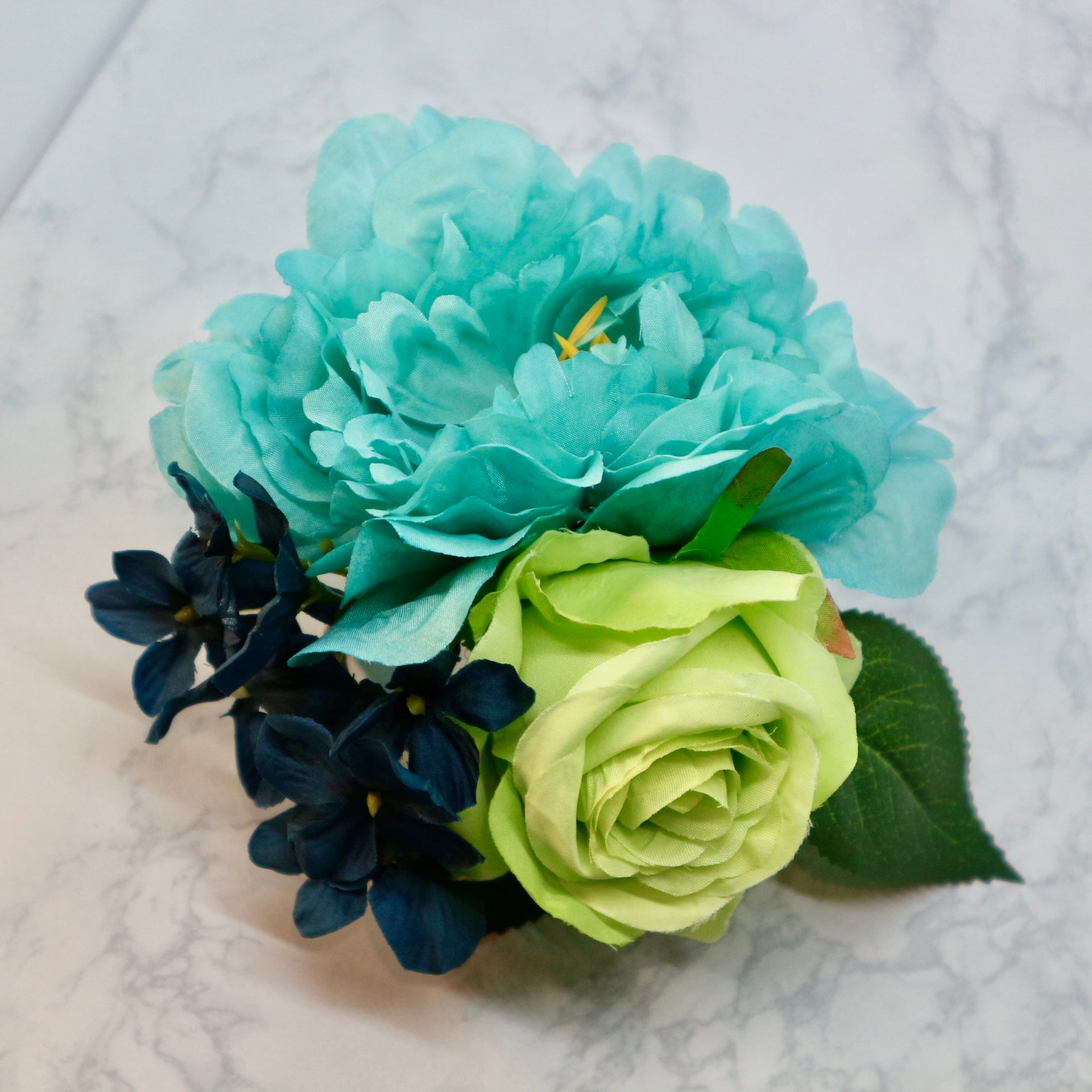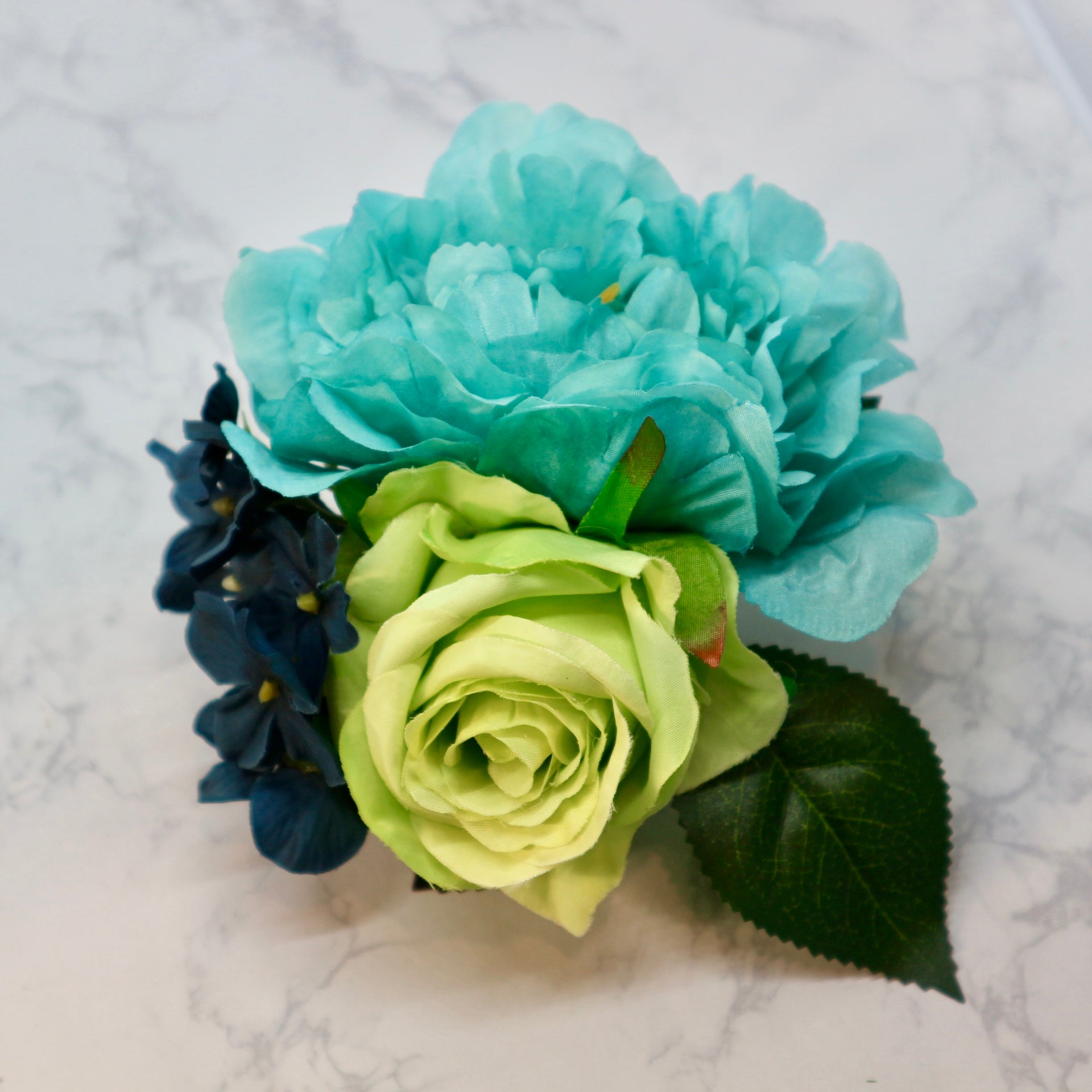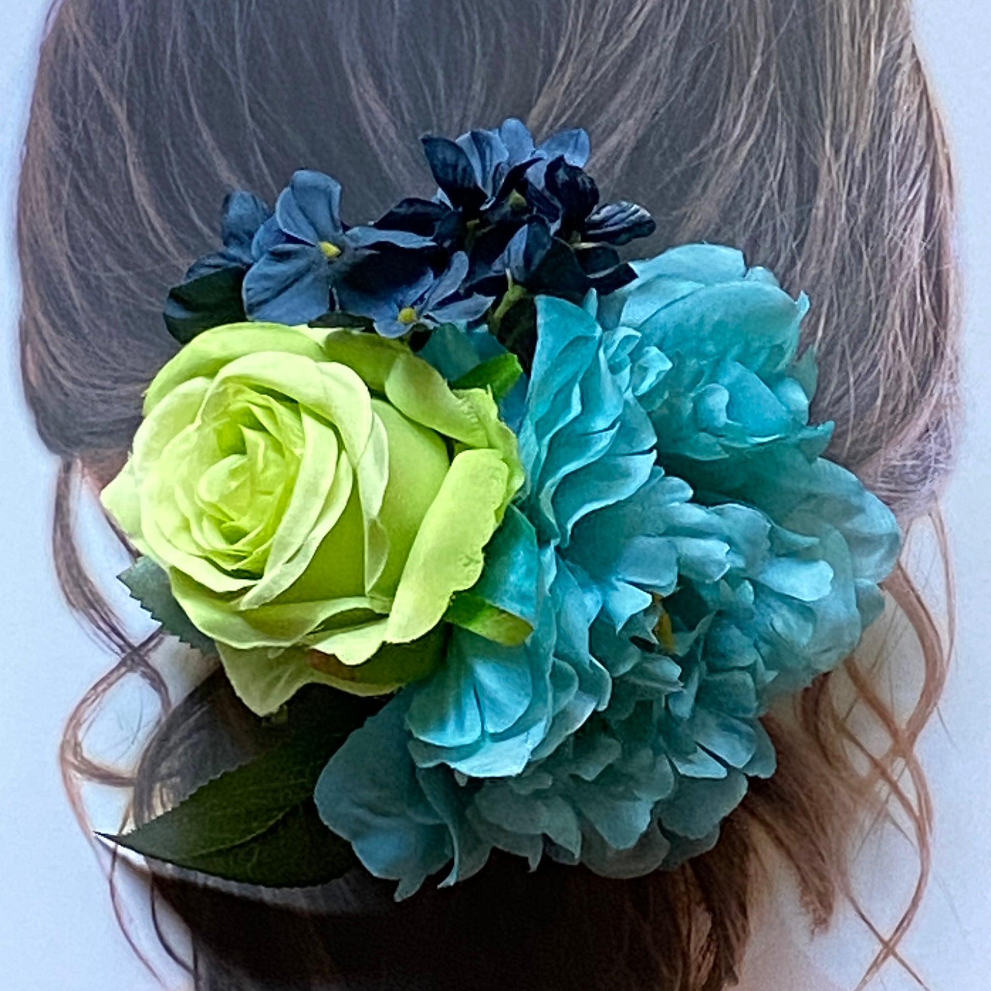 ブルーのピオニーとライトグリーンの薔薇、ダークブルーのアジサイの組み合わせでブーケスタイルにアレンジしたフラメンコ向けの花飾り(フローレス)です。やわらかいワイヤーを使っていますので、お花を一列にに並べる等、お花の位置は自由に動かすことができます。