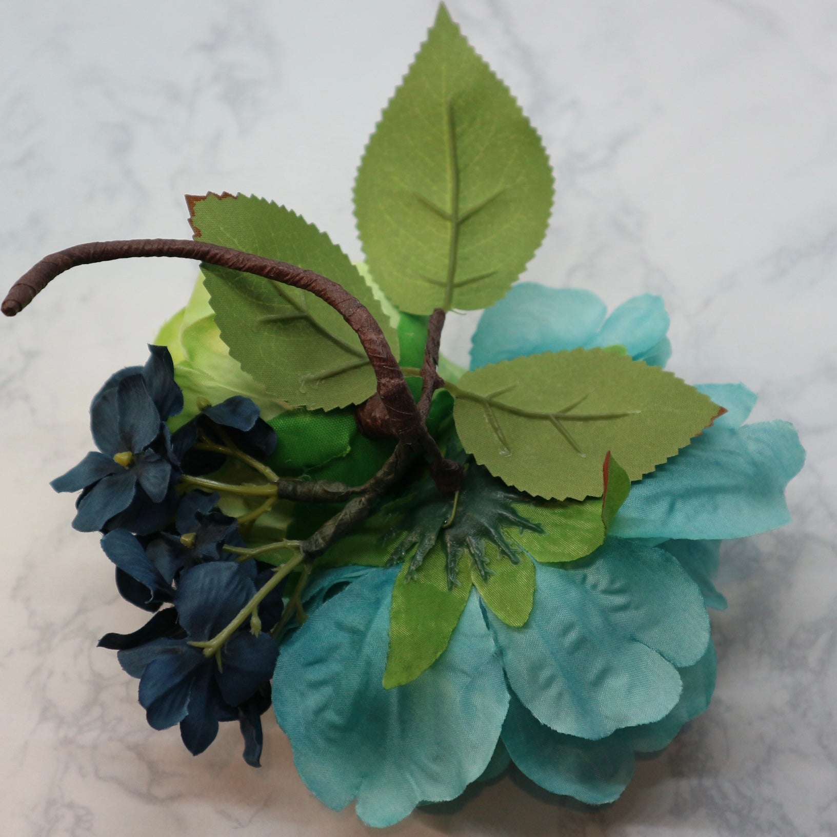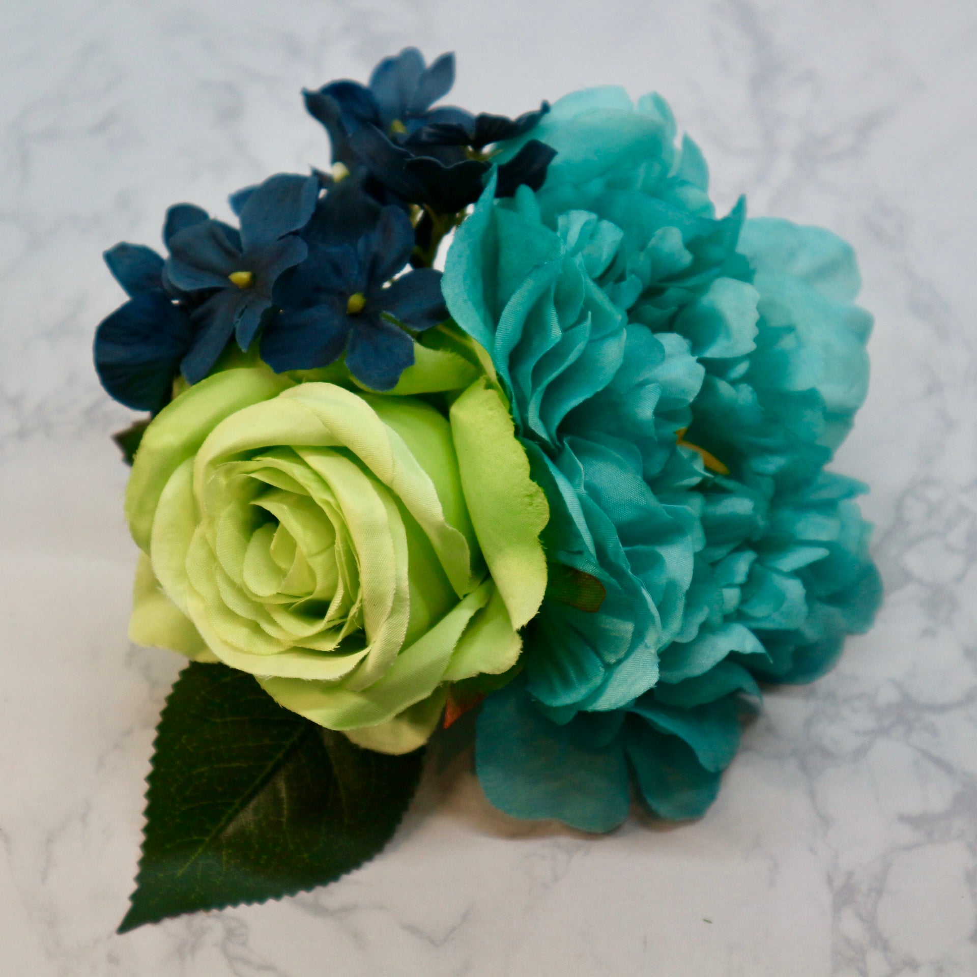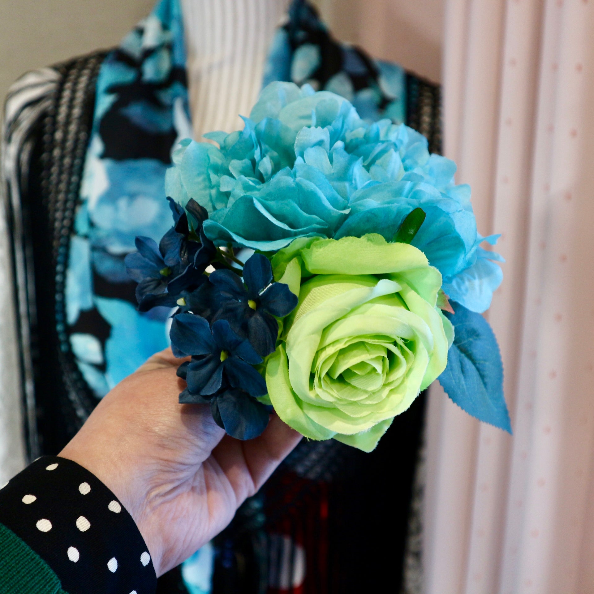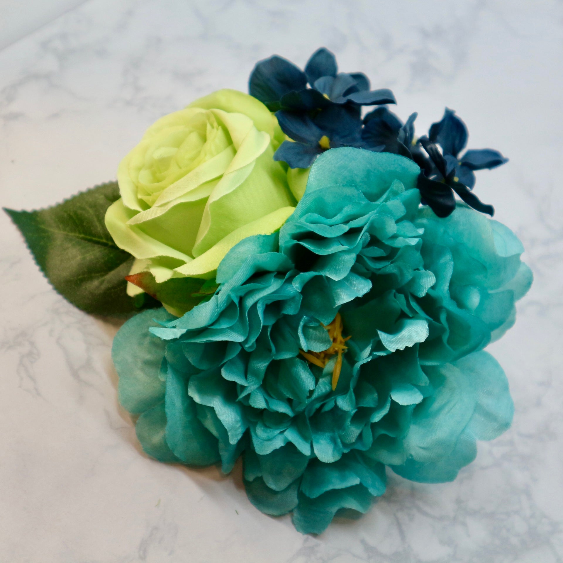 ブルーのピオニーとライトグリーンの薔薇、ダークブルーのアジサイの組み合わせでブーケスタイルにアレンジしたフラメンコ向けの花飾り(フローレス)です。やわらかいワイヤーを使っていますので、お花を一列にに並べる等、お花の位置は自由に動かすことができます。